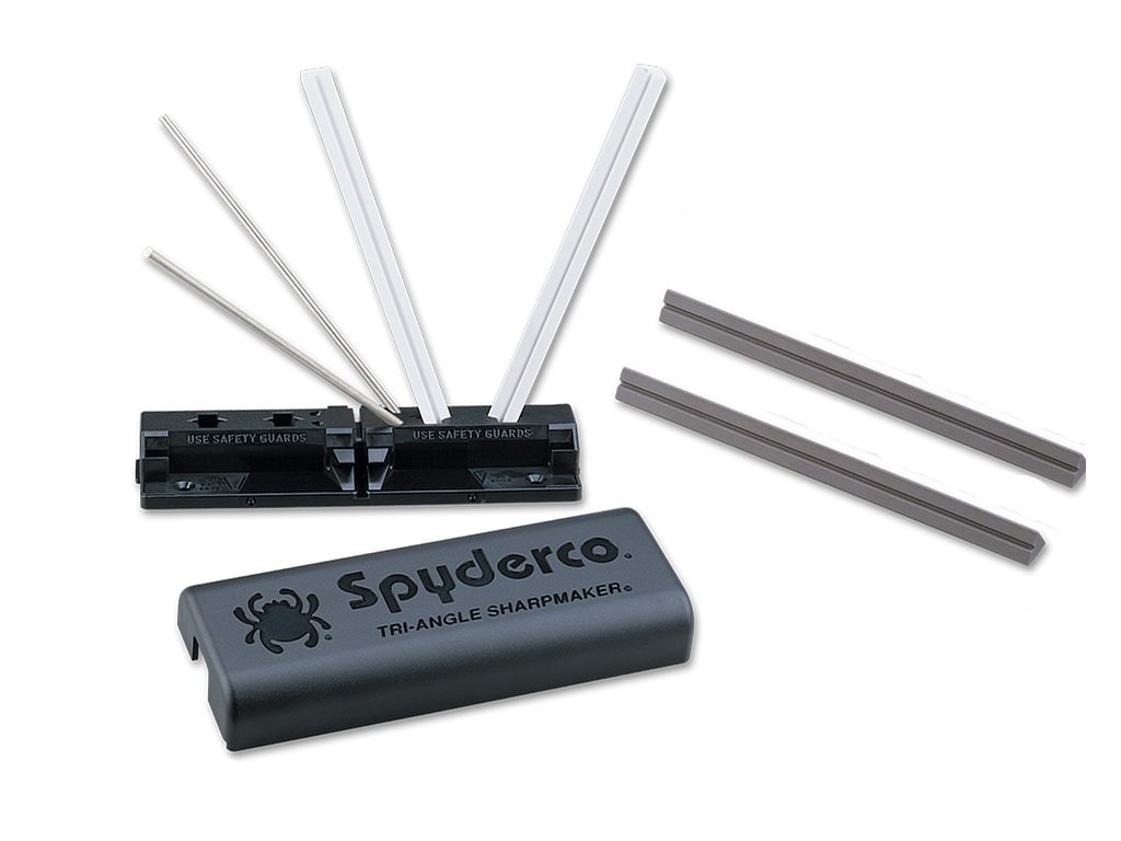 Aparatul de ascuțit cuțite Spyderco Triangle Sharpmaker face ascuțirea cuțitelor ușoară și eficientă. Ascuțirea poate fi realizată și de începători, fiind necesare doar câteva minute de practică. Sharpmaker include două perechi de pietre de ascuțit ceramice, de culoare maro și albă. Pietrele maro au o granulație mai grosieră și sunt folosite pentru ascuțirea cuțitelor tocite. Pietrele albe au o granulație mai fină și sunt potrivite pentru ascuțirea fină tăișurilor. Pietrele sunt triunghiulare, latura plată permite ascuțirea tăișului, în timp ce marginile sunt folosite pentru ascuțirea lamei zimțate. O canelură pe lungimea fiecărei pietre vă permite să ascuțiți obiecte ascuțite, cum ar fi cârligele de pescuit, săgețile etc. include o serie de tijele de siguranță din aluminiu, care protejează mâinile în timpul ascuțirii. Toate componentele se potrivesc într-o structură din plastic ABS.