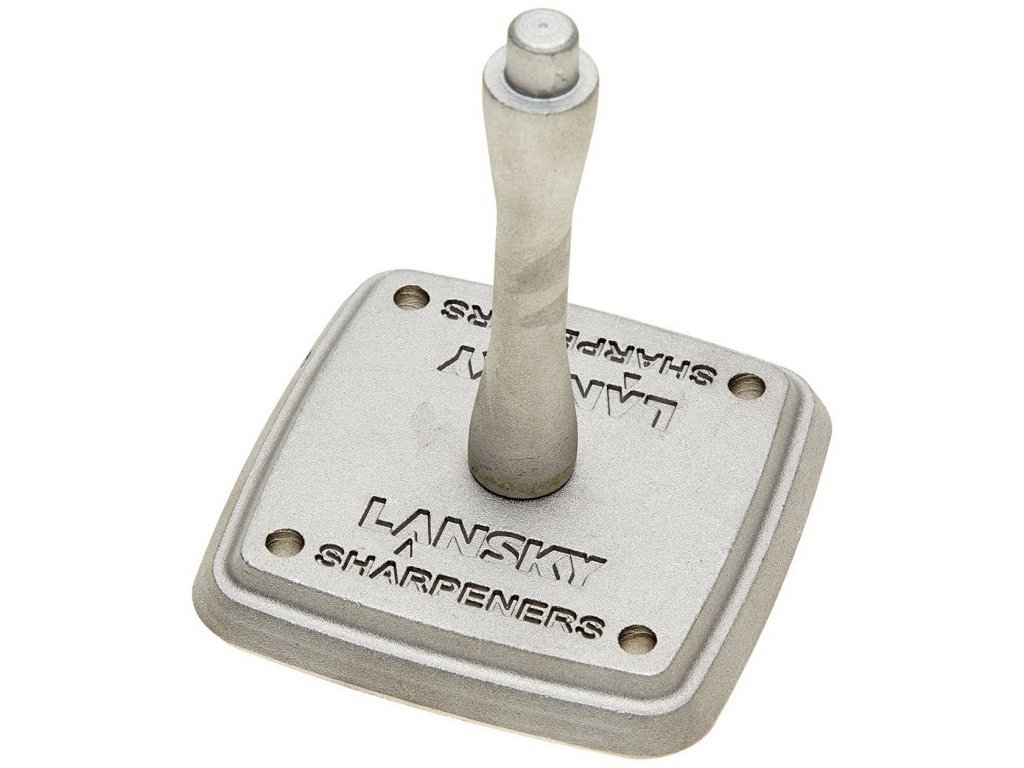 Stand metalic pentru aparat de ascuțit cuțite Lansky. Baza are găuri pentru înșurubarea suportului pe disc.