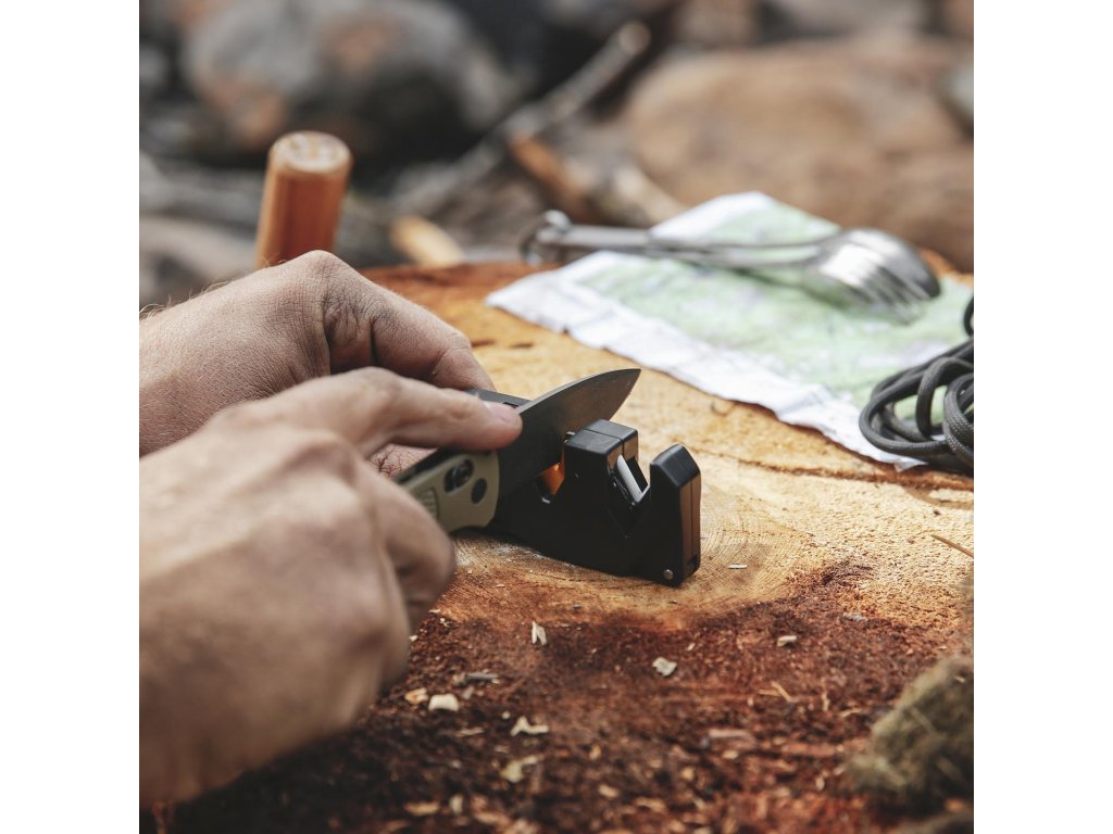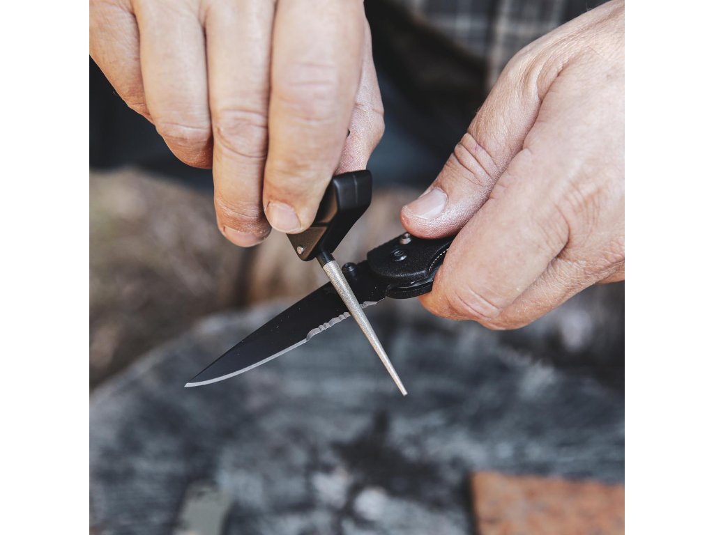 Bara diamantată conică cu granulație 320 este proiectată pentru ascuțirea lamelelor parțial zimțate sau pentru finisarea uneltelor cu tăișuri fine și se pliază convenabil în baza ascuțitorului. Ascuțitorul este compact și ușor de transportat chiar și în buzunarul pantalonilor, în plus are un orificiu pentru șnur, ceea ce face transportul și mai convenabil.