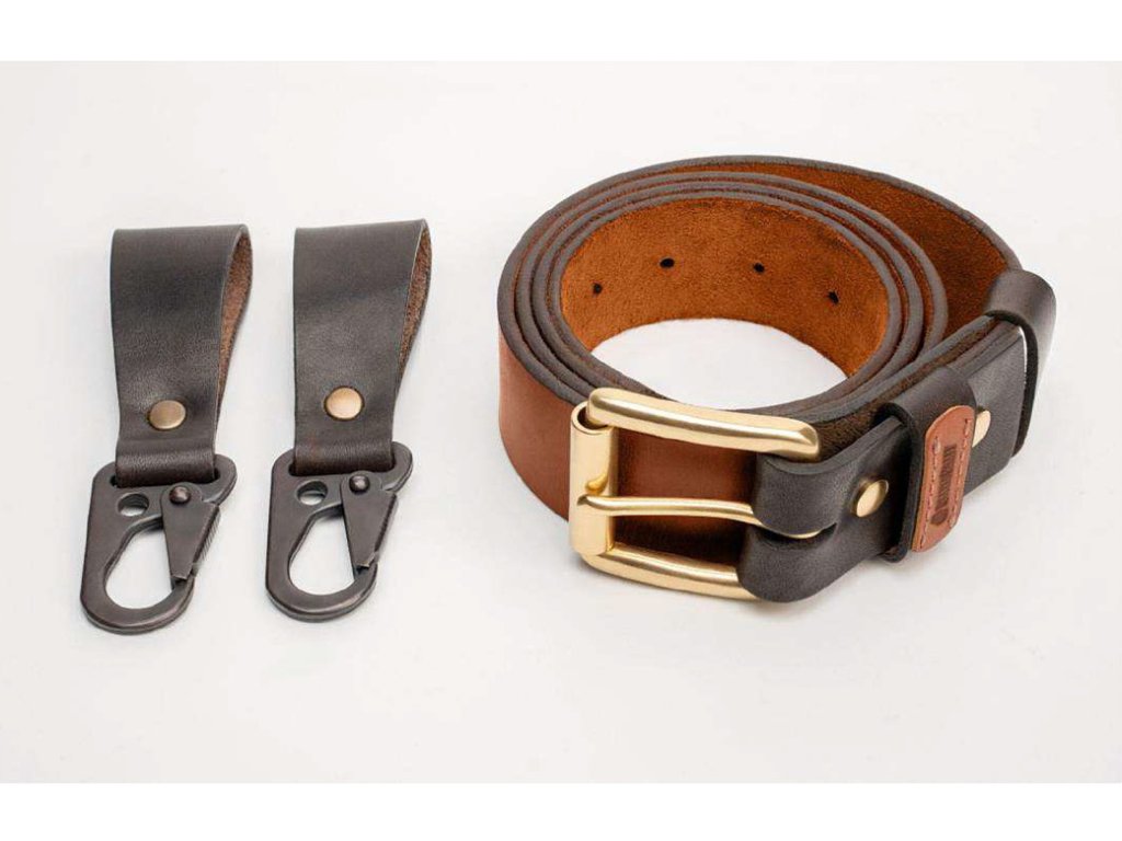 Curea lungime 137,5 cm, din piele naturală de vită, lățime 4 cm, cataramă din alamă, două carabine pentru agățarea echipamentului dvs. pentru activități în aer liber.