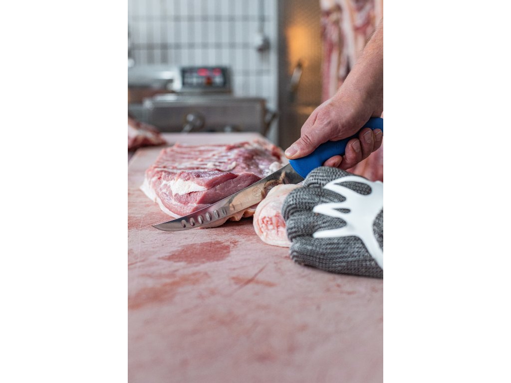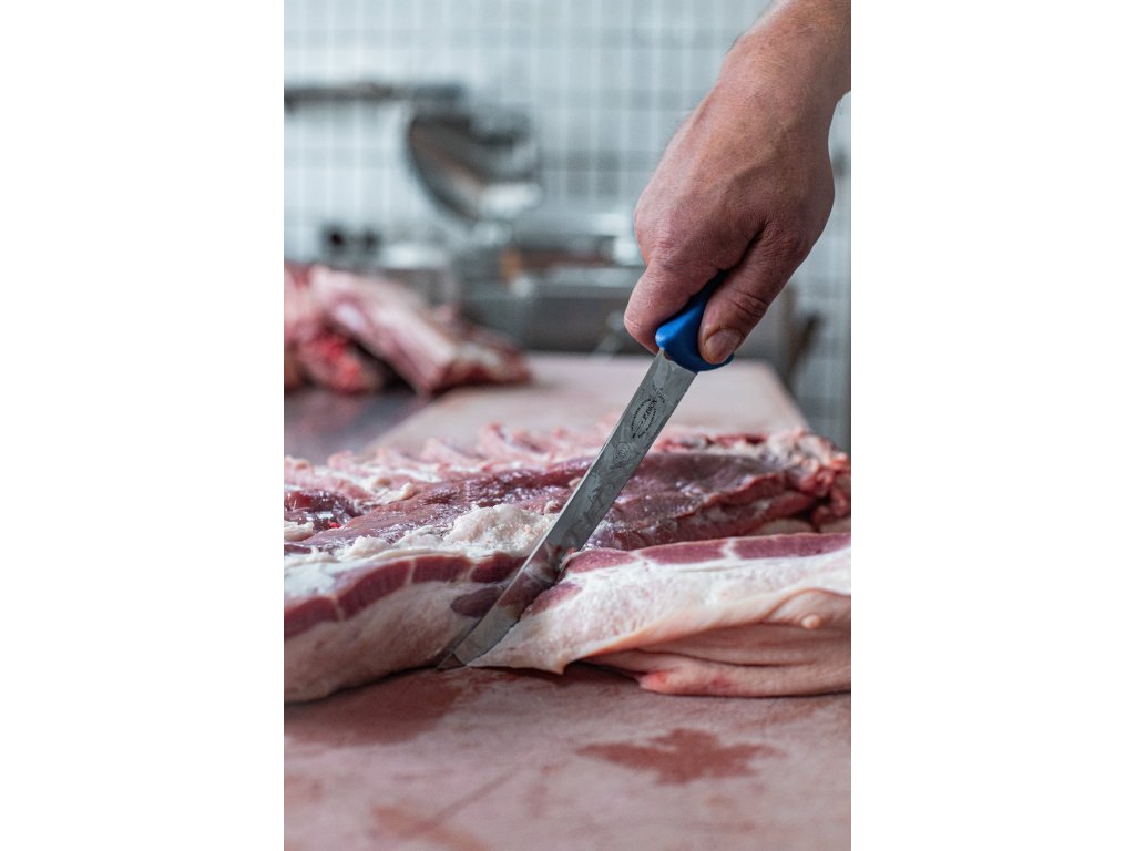 Cuțit pentru măcelărie folosit pentru tranșat. Lamă cu tăiș special, din oțel inoxidabil 21 cm lungime, lungime totală 34,54 cm. Mâner ergonomic din plastic albastru.
