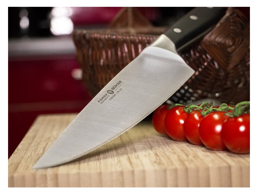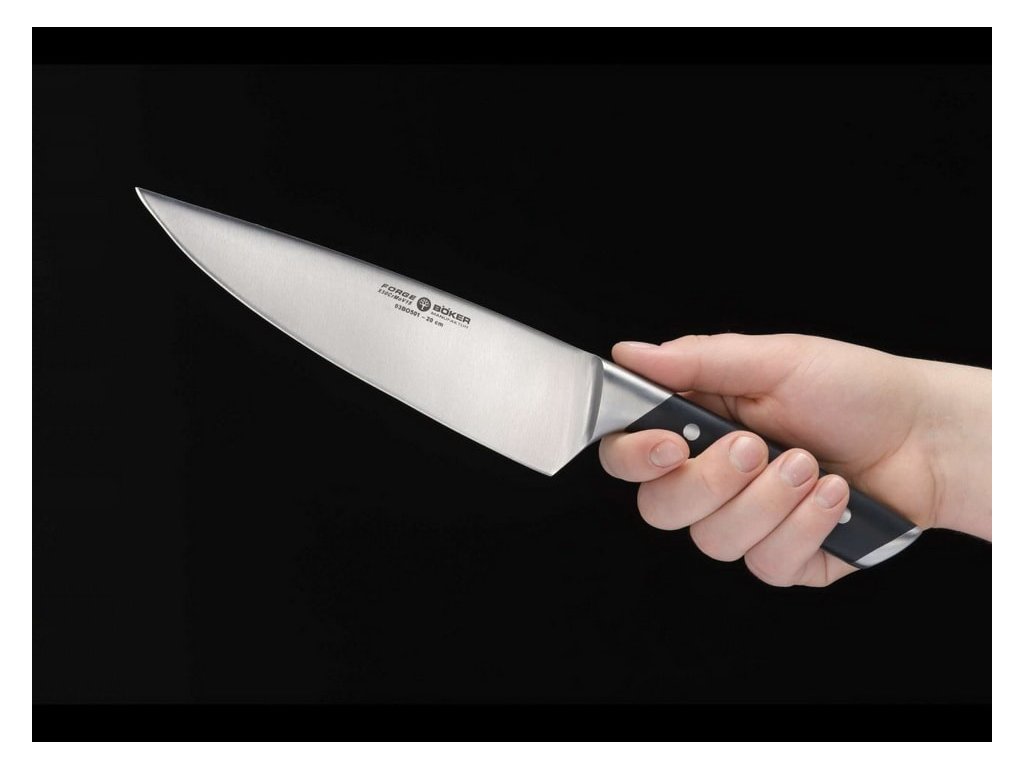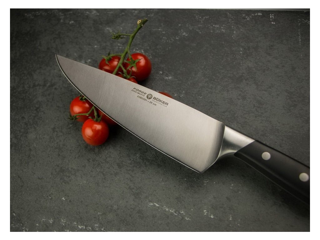 Cuțit de bucătărie de lux Böker din gama Forge, fabricat în Solingen, Germania. Acest cuțit de bucătar mare, universal este capabil să facă față oricărei sarcini în bucătărie. Are o construcție integrală, realizat din oțel crom-molybdén-vanadiu X50CrMoV15, care este mai rezistent și menține mai bine. Mânerul din plastic ABS oferă o prindere excelentă și un aspect atrăgător.