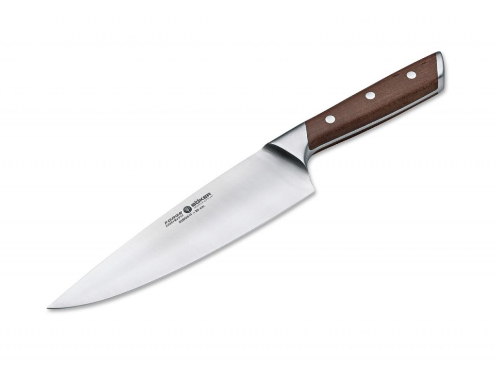 Cuțit de bucătărie de lux Böker din gama Forge, fabricat în Solingen, Germania. Acest cuțit de bucătar mare, universal este capabil să facă față oricărei sarcini în bucătărie. Are o construcție integrală, realizat din oțel crom-molybdén-vanadiu X50CrMoV15, care este mai rezistent și menține mai bine. Mânerul din lemn de arțar oferă o prindere excelentă și un aspect atrăgător.