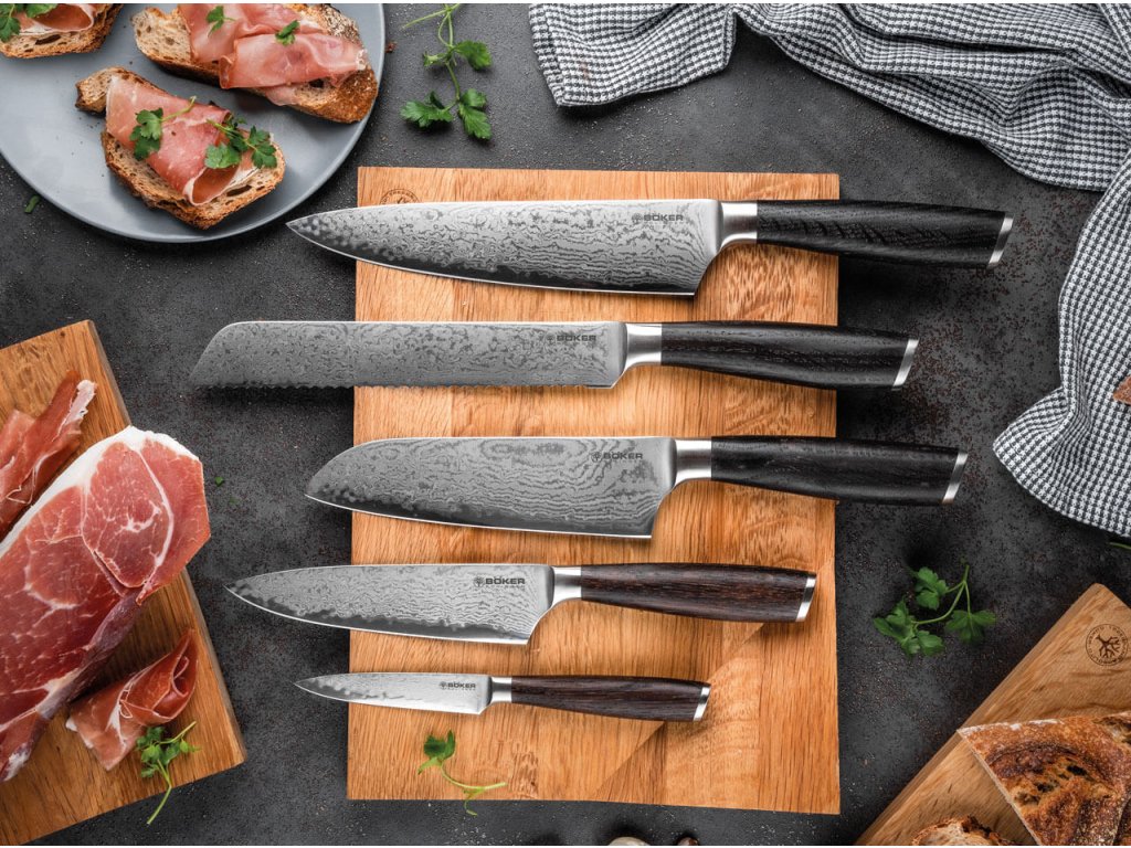 Cuțit de bucătărie Böker Meisterklinge Damascus Larges cu lungimea lamei de 19,8 cm din seria premium Meisterklinge Damascus de cuțite de bucătar. Create pentru bucătarul exigent, aceste cuțite radiază la prima vedere un aspect premium, un mâner perfect echilibrat și o lama damascus exclusivistă. Cuțite de bucătărie care nu numai că taie, dar vă vor duce creațiile culinare la nivelul următor.