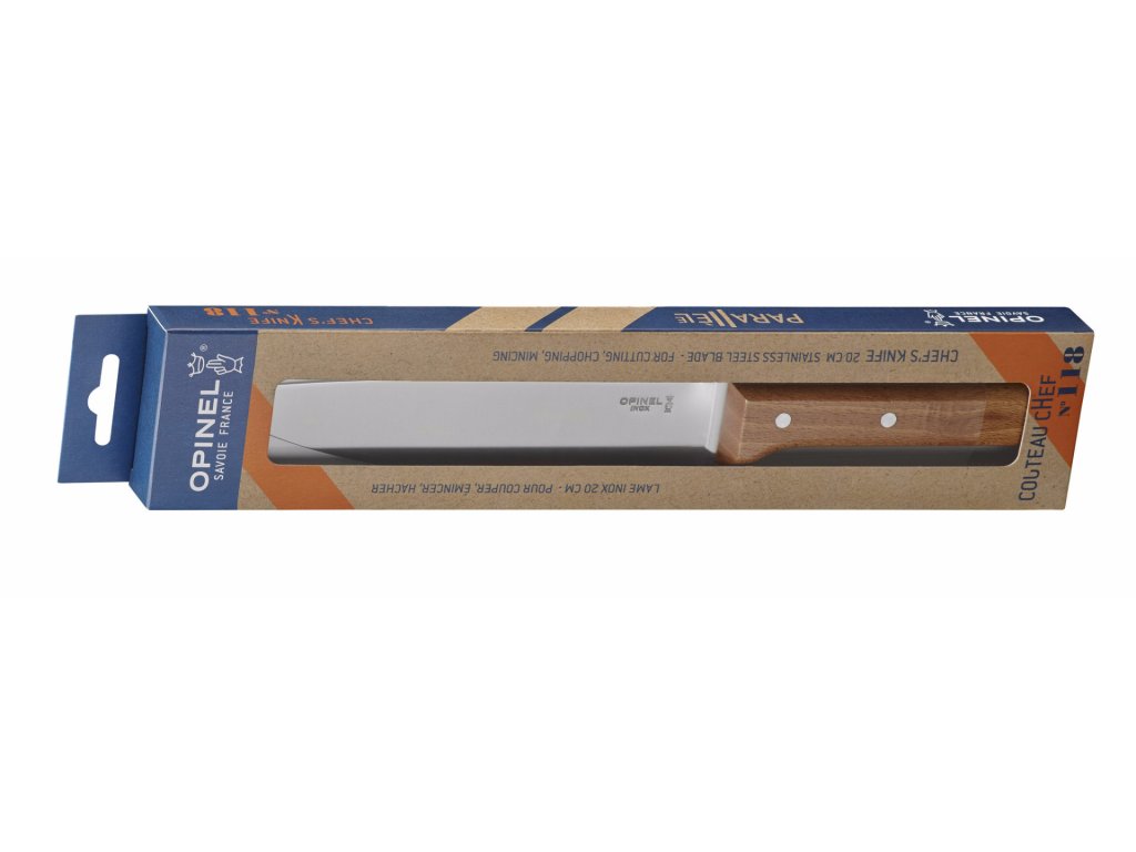 Cuțit de bucătar de la producătorul francez Opinel, cu lamă din oțel inoxidabil X50CrMoV15 și mâner din lemn de fag lăcuit. Protecția de la capătul mânerului vă protejează mâna de alunecare și crește siguranța atunci când lucrați cu cuțitul.