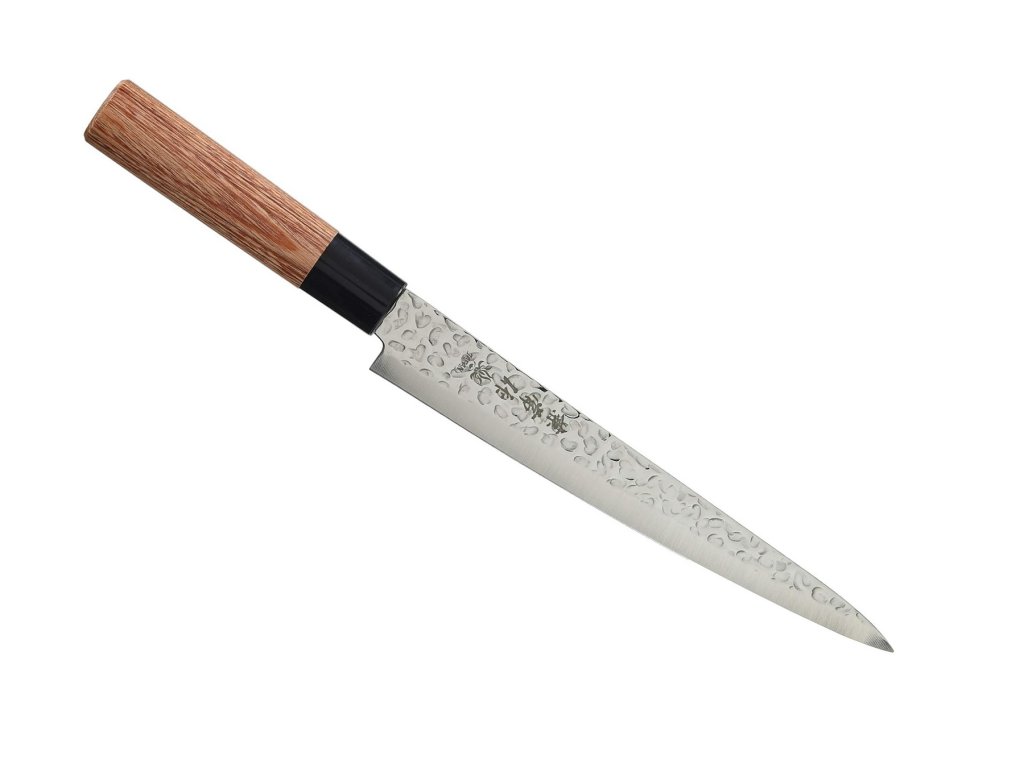 Cuțitul Sujihiki este ideal pentru tăierea precisă a feliilor subțiri de carne proaspătă sau afumată, pește sau legume. Lama lungă de 21 cm permite o tăiere precisă și perfectă, pe care chiar și bucătarii profesioniști o vor aprecia. Lungimea totală a cuțitului este de 34 cm, ceea ce îl face alegerea ideală pentru cei care apreciază nu numai performanța, ci și frumusețea și tradiția producătorilor de cuțite din Japonia. Mânerul este realizat din lemn, care nu numai că are un aspect estetic elegant, dar garantează și o prindere confortabilă și fermă. Lăsați-vă fermecați de măiestria Japoniei și adăugați astăzi acest uimitor instrument de bucătărie la colecția dvs.!