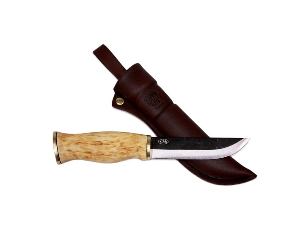 Cuțit nordic tradițional Ahti Kaato cu mâner masiv și lamă mai lungă. Mânerul din lemn de mesteacăn este tratat cu ulei de in și finisat pe ambele cu un bolster din alamă. Lama de lungime 12 cm este fabricată din oțel carbon cu duritatea 58-59 HRC, de la producătorul Laurin Metalli. Cuțitul este livrat cu o teacă din piele de calitate care poate fi agățată la curea.