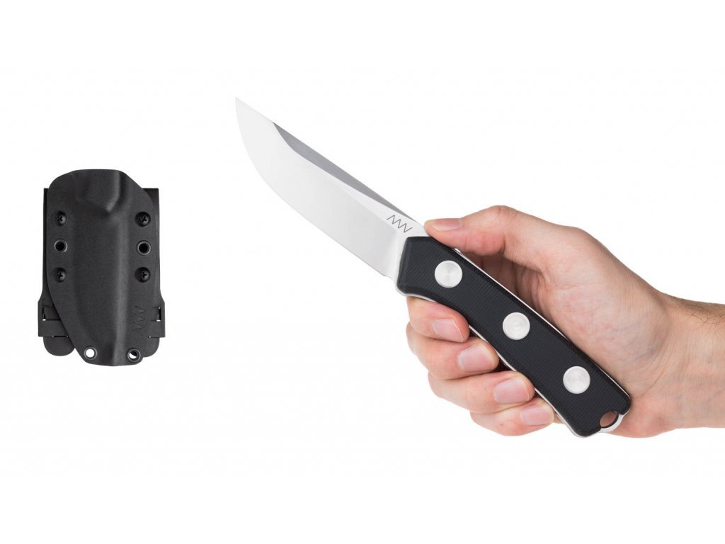 ANV P200 este un cuțit de dimensiuni medii, robust, dar agil, destinat în special vânătorilor și utilizării în natură. Este un instrument rezistent, care va rezista utilizării zilnice intense timp de mulți ani. Lama cuțitului este fabricată din oțel Sleipner, duritate 58 HRC, care rezistă bine la uzură și se ascute destul de ușor. Lungimea lamei drepte este de 10 cm, finisaj stenewash și o formă de tip skinner. Lama este universală și este potrivită pentru îndepărtarea pielii, lucrul cu alimente. Mânerul este fabricate din G10 de culoare neagră (un material compozit puternic și rezistent) cu un finisaj anti-alunecare. Teaca este fabricată din material Kydex și oferă opțiuni variabile de agățare. Este potrivită atât pentru utilizatorii dreptaci, cât și pentru stângaci. Puteți atașa teaca la un rucsac sau la alt echipament, deoarece teaca este compatibilă cu sistemele MOLLE, PALS, Laser Cut și Blade - Tech.