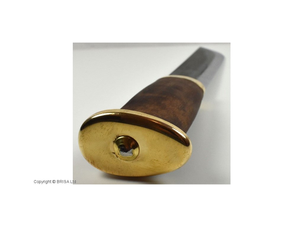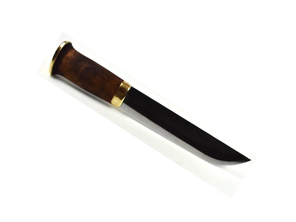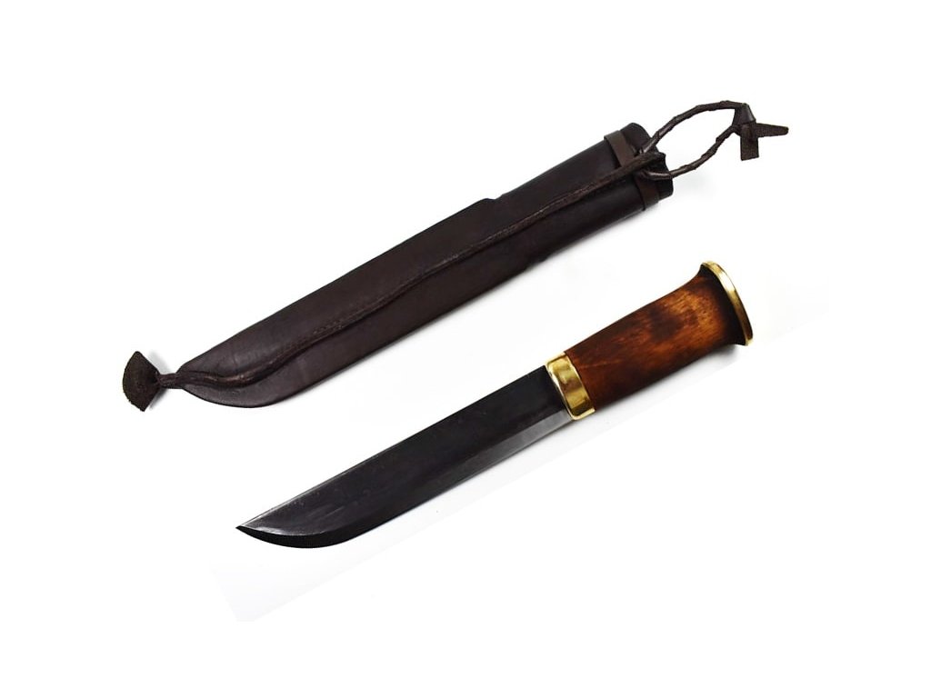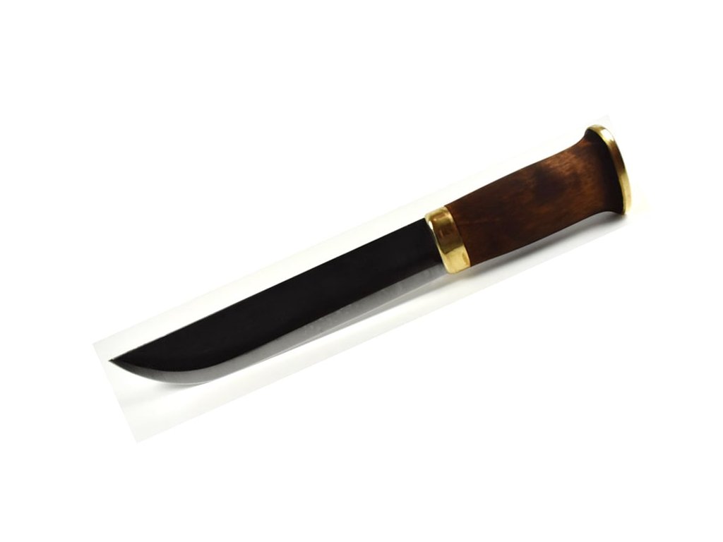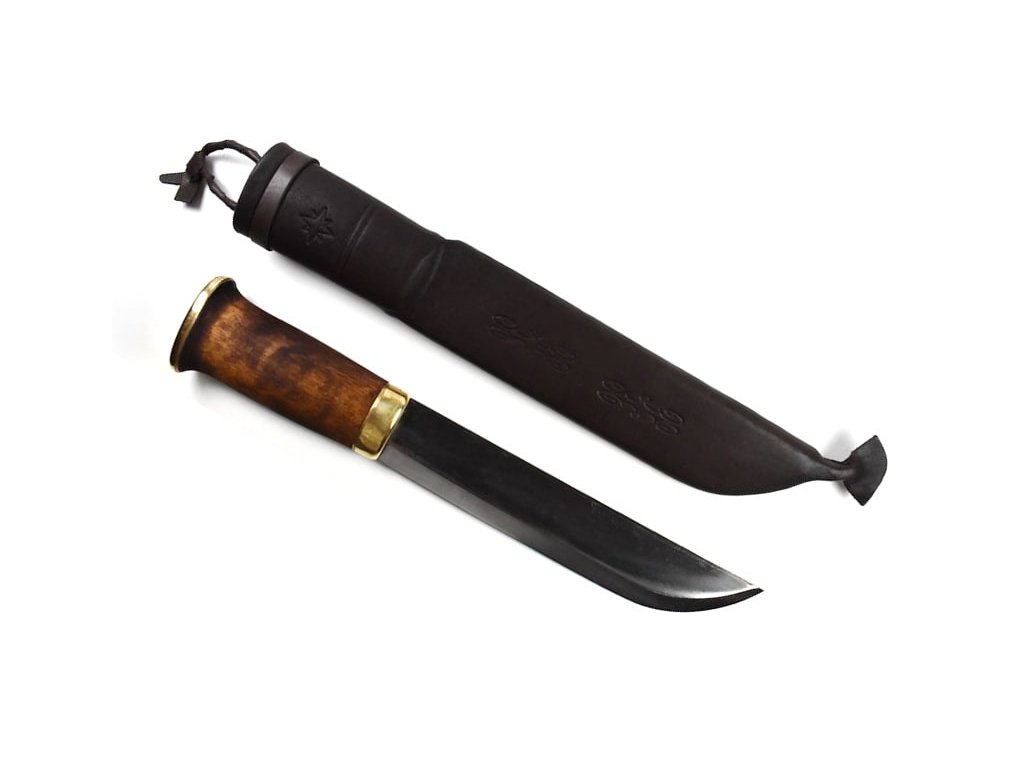 Cuțit nordic tradițional tip Leuku, de dimensiuni mari. Mâner fabricat din lemn de mesteacăn creț. Lamă de lungime 21 cm, din oțel carbon cu duritate de 58-59 HRC, de la producătorul Laurin Metalli. Oțelul carbon rezistă bine la uzură și este ușor de ascuțit, dar este mai predispus la rugină (cuțitul trebuie curățat și uscat bine după utilizare, de asemenea, este recomandabil să ungeții din când în când lama cu ulei). Teacă din piele cu clemă pentru agățare. Leuku este un instrument tradițional în Laponia, unde este folosit pentru toate activitățile obișnuite, de la prelucrarea mai ușoară a lemnului, cum ar fi tăierea unor bucăți mai mici de lemn sau îndepărtarea scoarței, până la procesarea unei capturi.