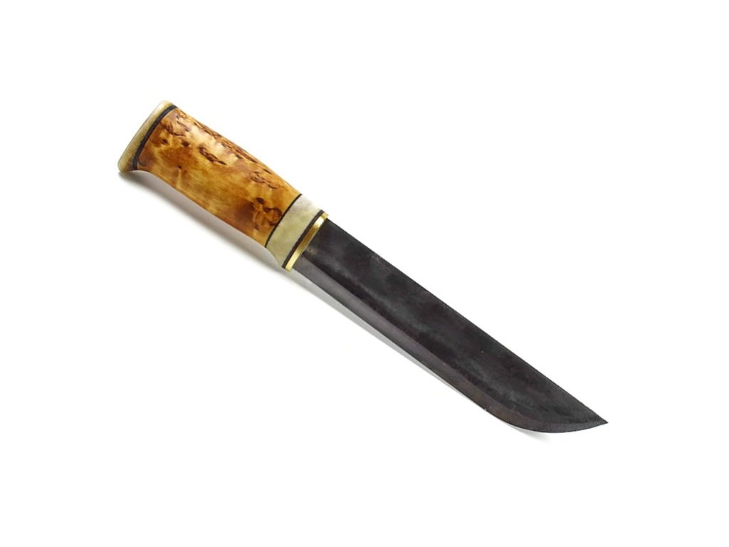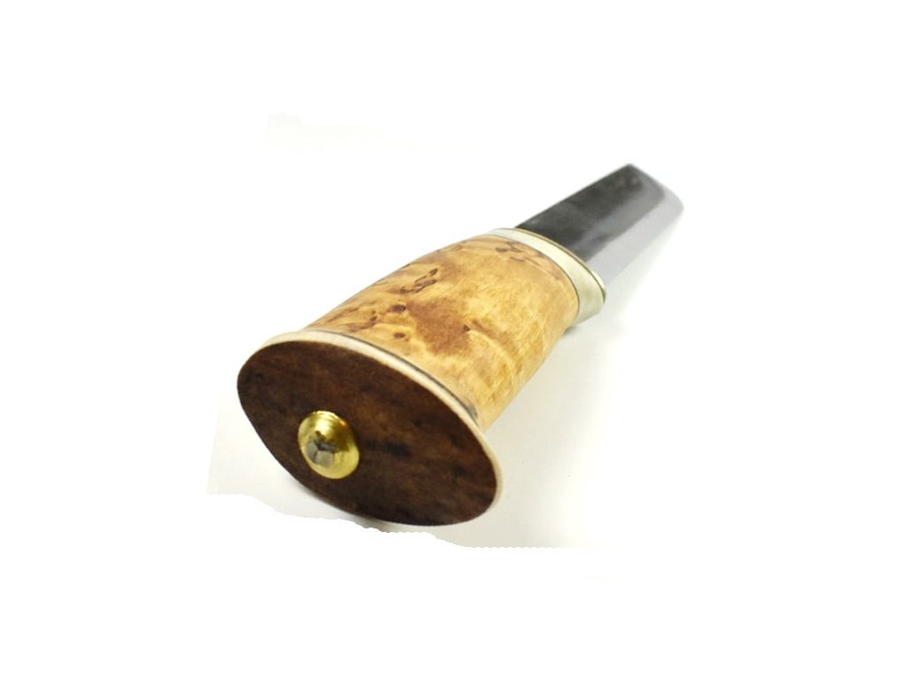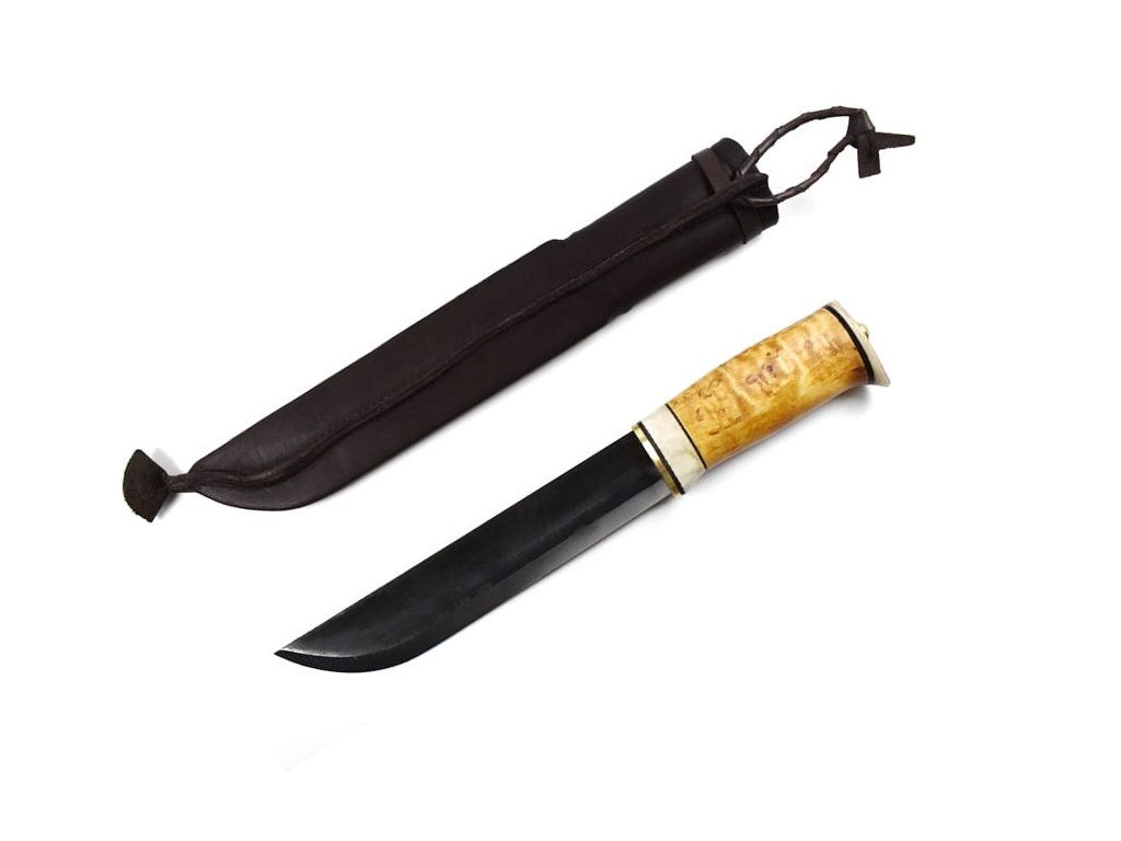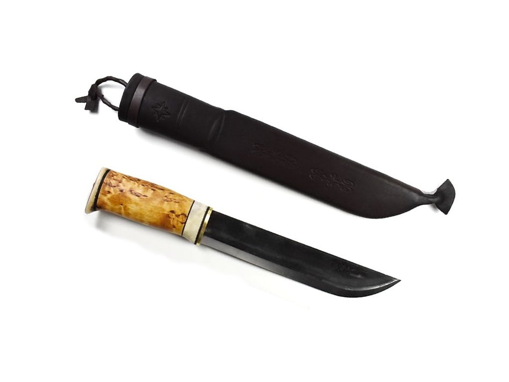 Cuțit nordic tradițional tip Leuku, de dimensiuni mari. Mâner fabricat din lemn de mesteacăn creț și orn de ren. Lamă de lungime 21 cm, din oțel carbon cu duritate de 58-59 HRC, de la producătorul Laurin Metalli. Oțelul carbon rezistă bine la uzură și este ușor de ascuțit, dar este mai predispus la rugină (cuțitul trebuie curățat și uscat bine după utilizare, de asemenea, este recomandabil să ungeții din când în când lama cu ulei). Teacă din piele cu clemă pentru agățare. Leuku este un instrument tradițional în Laponia, unde este folosit pentru toate activitățile obișnuite, de la prelucrarea mai ușoară a lemnului, cum ar fi tăierea unor bucăți mai mici de lemn sau îndepărtarea scoarței, până la procesarea unei capturi.