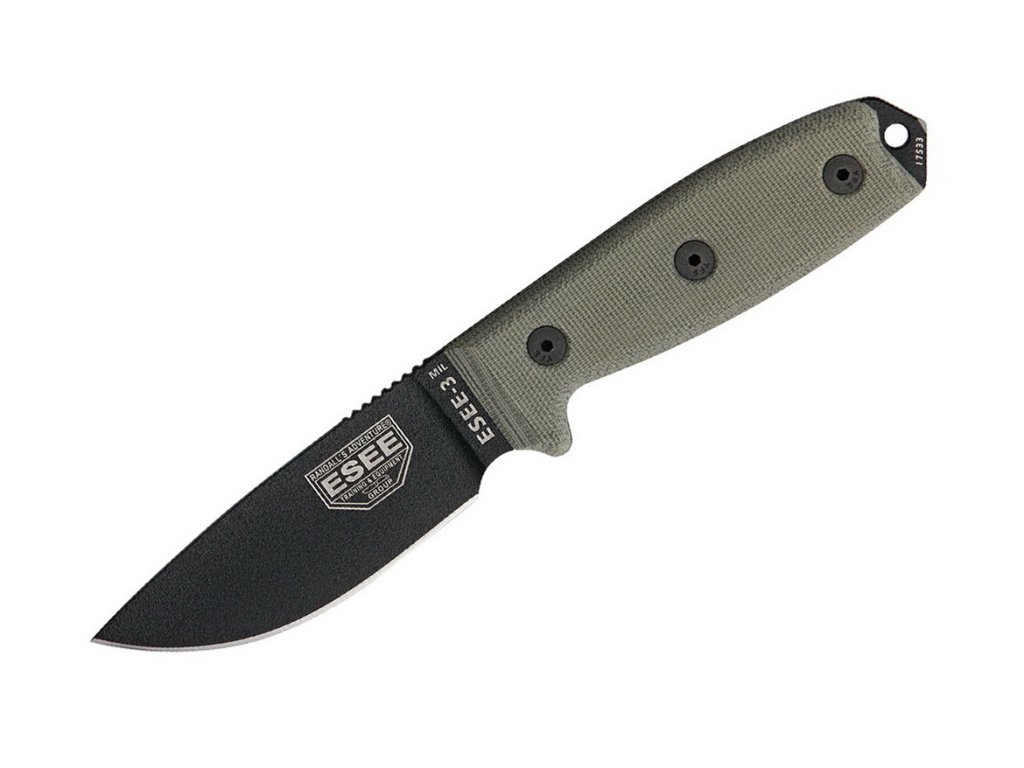 ESEE Model 3 MIL este un cuțit solid, foarte apreciat în rândul forțelor armate. Lama de lungime 9,8 cm, fabricată din oțel carbon 1095, are un finisaj negru și un tăiș tip flat grind. Deoarece este din oțel carbon, tinde să ruginească și să dezvolte patină, în special pe tăiș și acolo unde finisajul este deteriorat în timp. Din acest motiv, este recomandabil să întrețineți oțelul cu ulei. Modelul 3-MIL este echipat cu un spărgător de sticlă ascuțit. Mâner din micarta, verde. Teacă din plastic, neagră, cu clemă pentru agățare și platformă MOLLE.