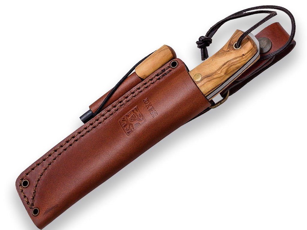 Cuțitul este livrat cu o teacă din piele de calitate, cu posibilitatea agățării la curea și cu un kit pentru aprinderea focului. Designul cuțitului este realizat de J. Sabater.