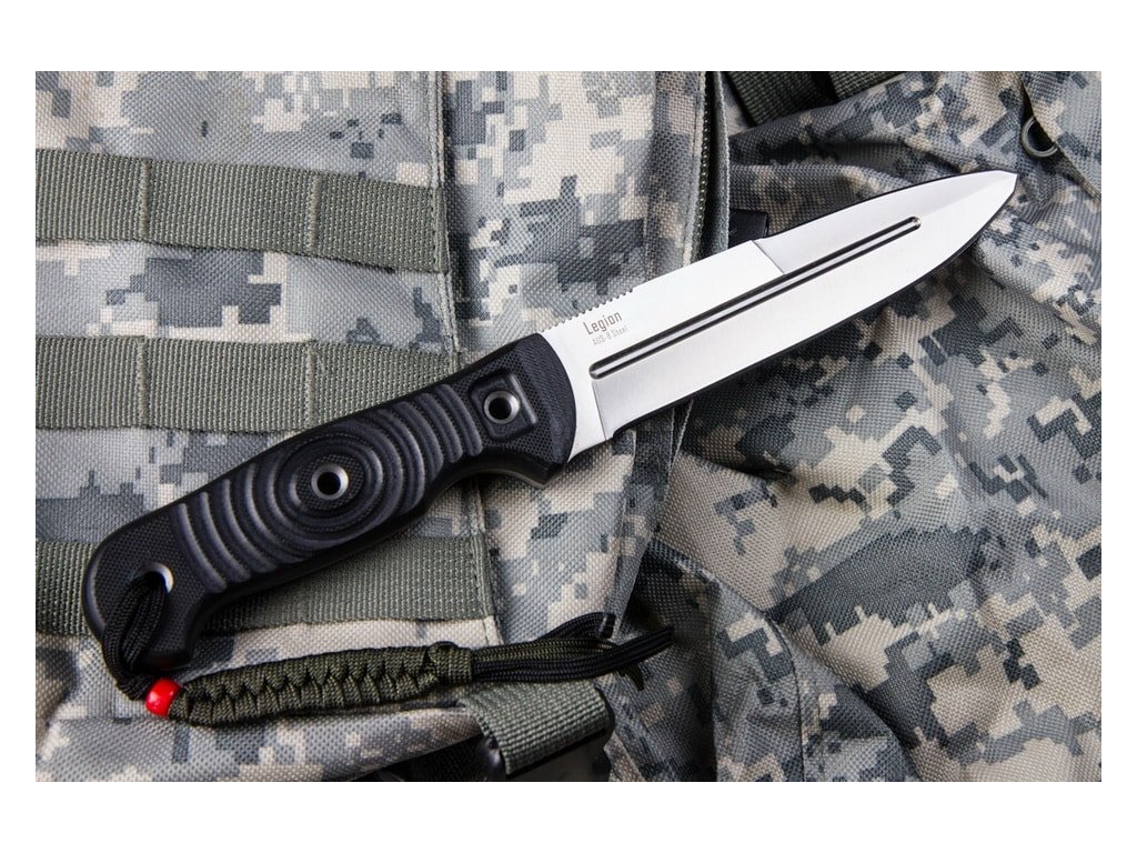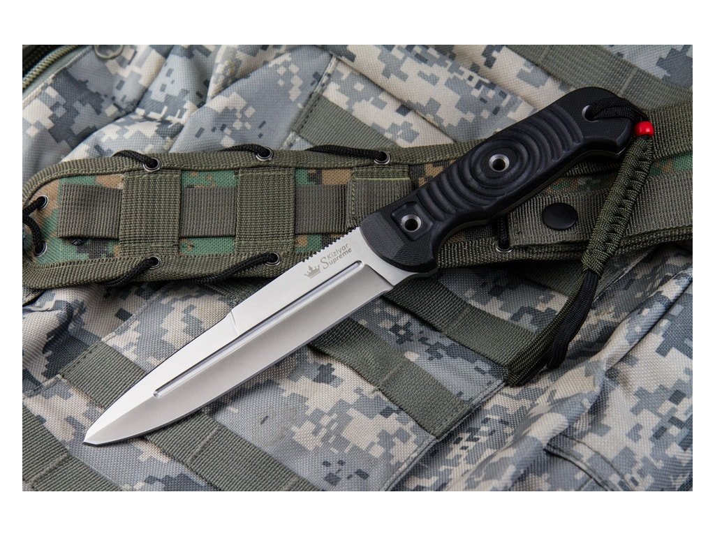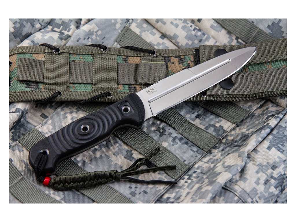 Cuțit mare pentru activități în aer liber, cu o construcție full tang (realizat dintr-o singură bucată de oțel). Lamă fabricată din oțel AUS-8, duritate 57-59 HRC, cu finisaj fin stonewash. Forma lamei face ca acest cuțit să fie ideal pentru înjunghiere eficientă și lucrări unde veți folosi vârful ascuțit al cuțitului. Cuțitul este proiectat în primul rând pentru unitățile de salvare și de urgență, dar va servi bine și vânătorii. Mâner fabricat din G10 - material compozit modern, foarte durabil și plăcut la atingere. Cuțitul este livrat cu o teacă nailon compatibilă cu sistemul Molle.