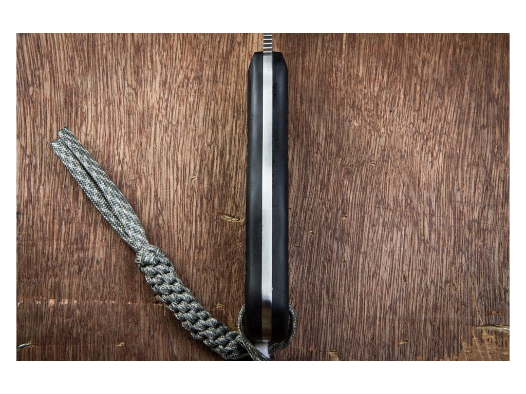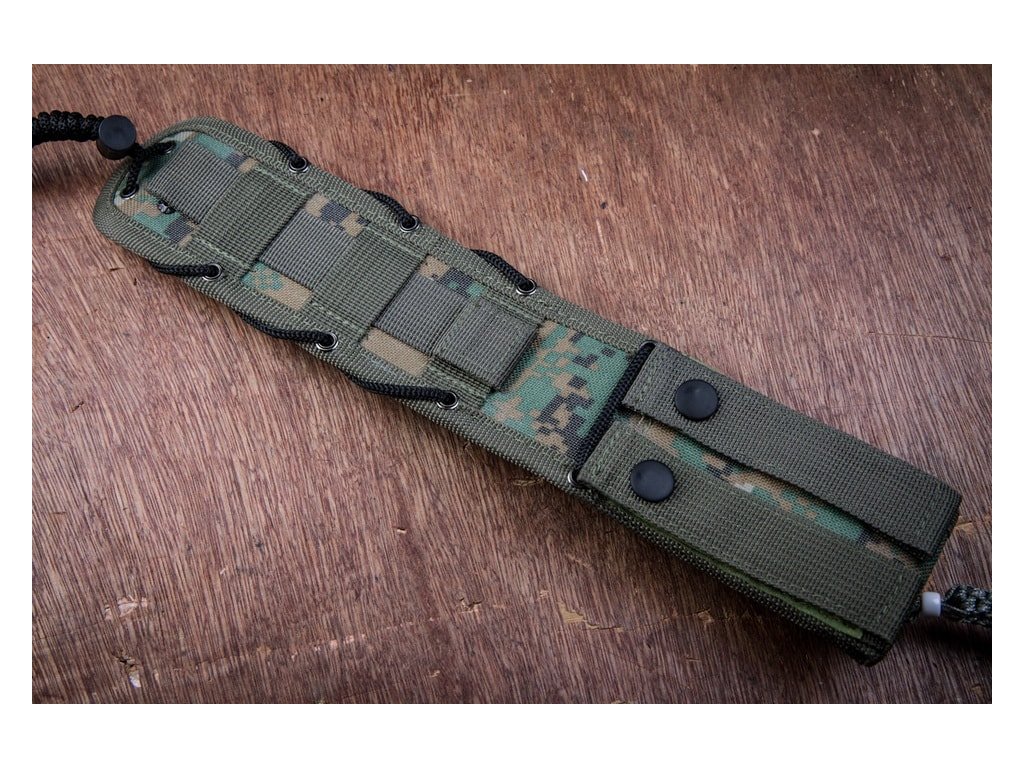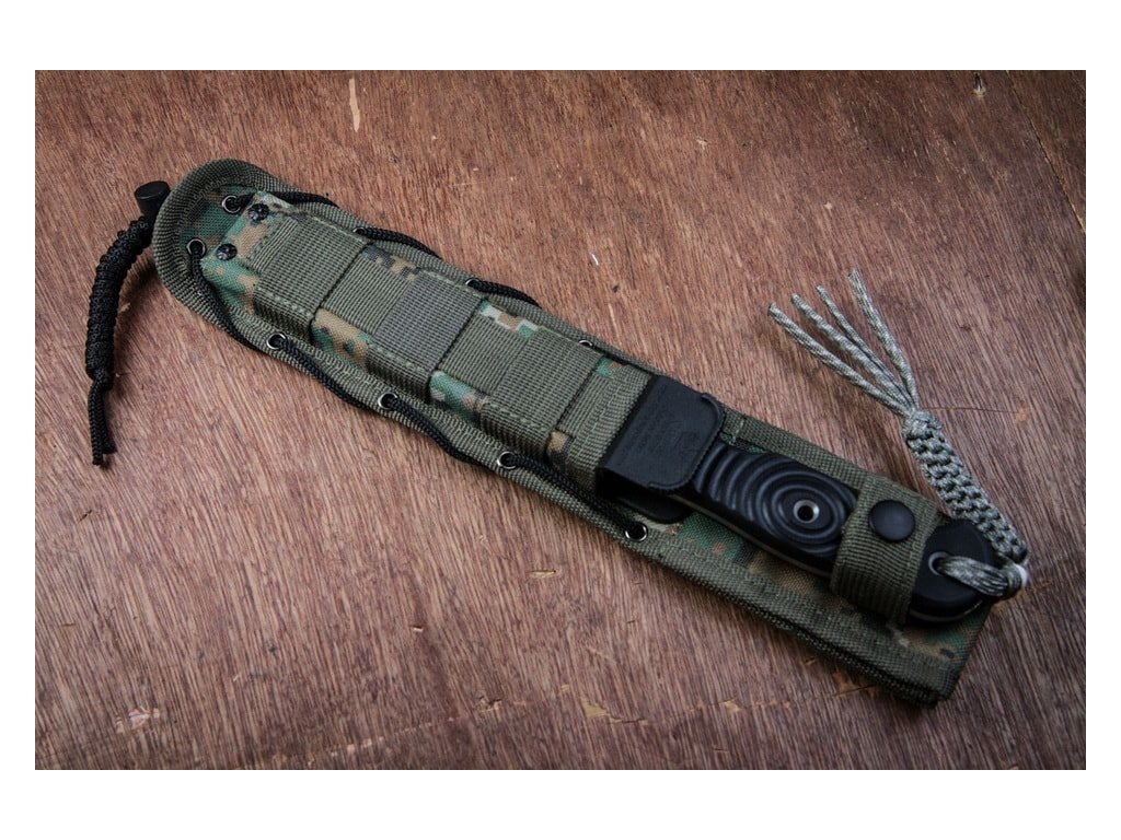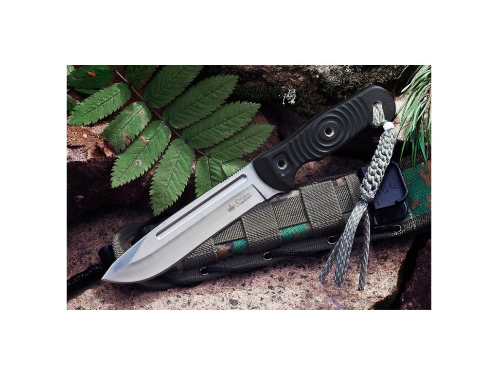 Cuțit pentru activități în aer liber cu o construcție solidă full tang (realizat dintr-o singură bucată de oțel). Lamă fabricată din oțel AUS-8, duritate 57-59 HRC, cu finisaj fin stonewash. Mâner fabricat din G10 - material compozit modern, foarte durabil și plăcut la atingere. Cuțitul este livrat cu o teacă nailon compatibilă cu sistemul Molle.