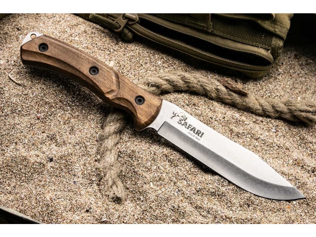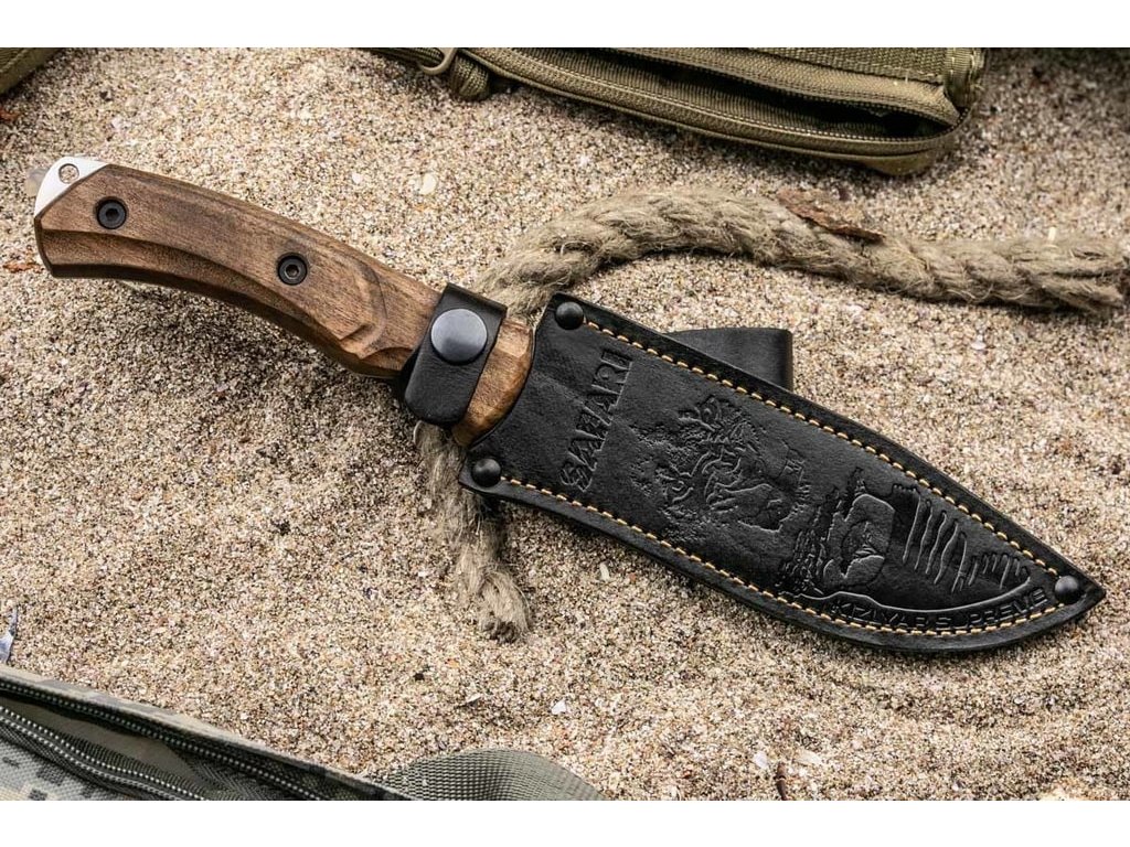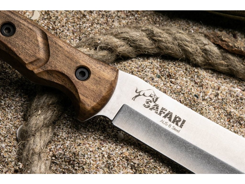Safari este un cuțit mare, cu o lamă lungă și subțire și un vârf ascuțit. Aceste caracteristici îl fac un cuțit excelent pentru prelucrarea capturilor mai mari și prezintă caracteristici de tăiere excelente. Construcția full tang îi asigură rezistența și fiabilitatea. Lama este fabricată din oțel inoxidabil AUS-8, duritate 57-59 HRC, cu un finisaj fin stonewash. Mânerul este fabricat din lemn de nuc caucazian. Cuțitul este livrat cu o teacă din piele.
