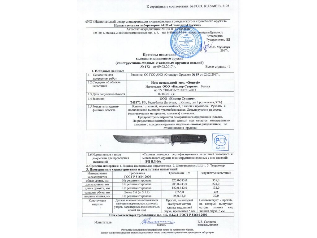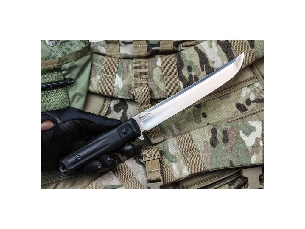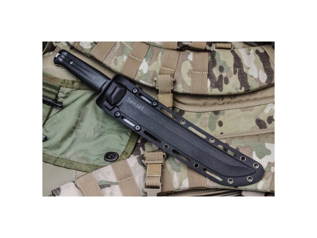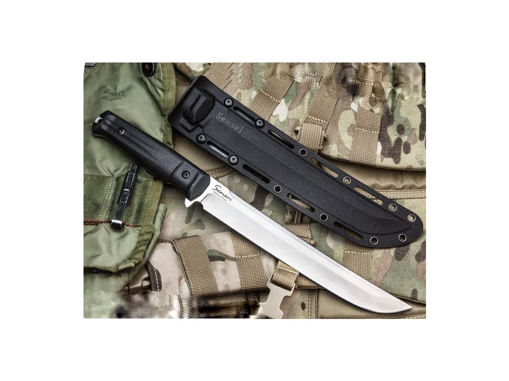 Sensei combină frumusețea cuțitelor orientale tradiționale cu designul și materialele moderne. Cuțitul inspiraț din designul săbiilor japoneze wakizashi are un aspect inconfundabil. Lama din oțel AUS-8, duritate 57-59 HRC, cu finisaj stonewash are lungimea de 22 cm. Rezistența cuțitului este asigurată de o construcție full tang și o grosime a lamei de 4,6 mm. Mânerul este fabricat din două straturi - stratul inferior este din plastic ABS, care asigură rezistența mânerului, stratul superior al mânerului este realizat din Kraton, care este plăcut la atingere și, în același timp, foarte durabil. Cuțitul este livrat cu o teacă din kydex.