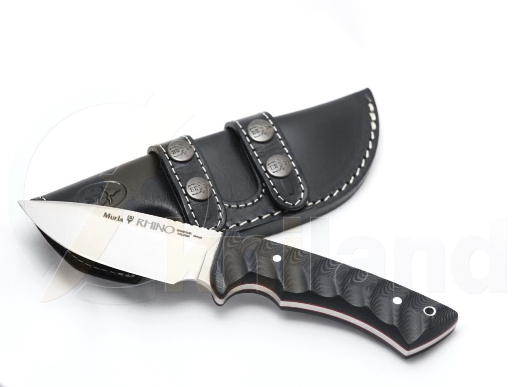 Cuțitul pentru supraviețuire Muela RHINO 10 SV.M este fabricat dintr-o singură bucată de oțel premium Sandvik 14C28N cu o duritate de până la 61 HRC, ceea ce îl face foarte durabil și va rezista chiar și în condiții dificile. Mânerul texturat este fabricat din micarta, cu finisaj negru. La capătul mânerului există o gaură cu un nit tubular pentru introducerea unui șnur. Cuțitul este livrat cu o teacă din piele de bună calitate care permite agățarea atât pe verticală, cât și pe orizontală.