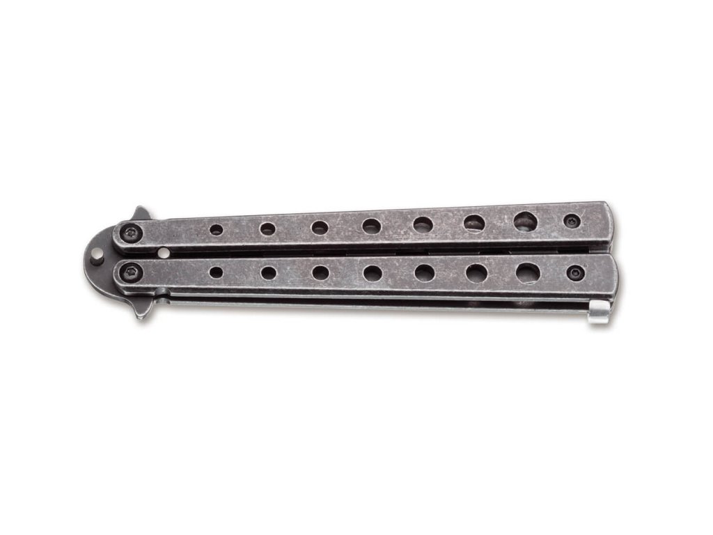 Cuțit Butterfly pentru antrenament de la Magnum by Böker. Acest cuțit Butterfly are o lamă neascuțită. În multe țări europene este ilegal să deții un cuțit Butterfly cu lamă ascuțită, așa că aceste versiuni de antrenament sunt populare printre pasionații europeni de cuțite care vor să încerce acest tip de cuțite.