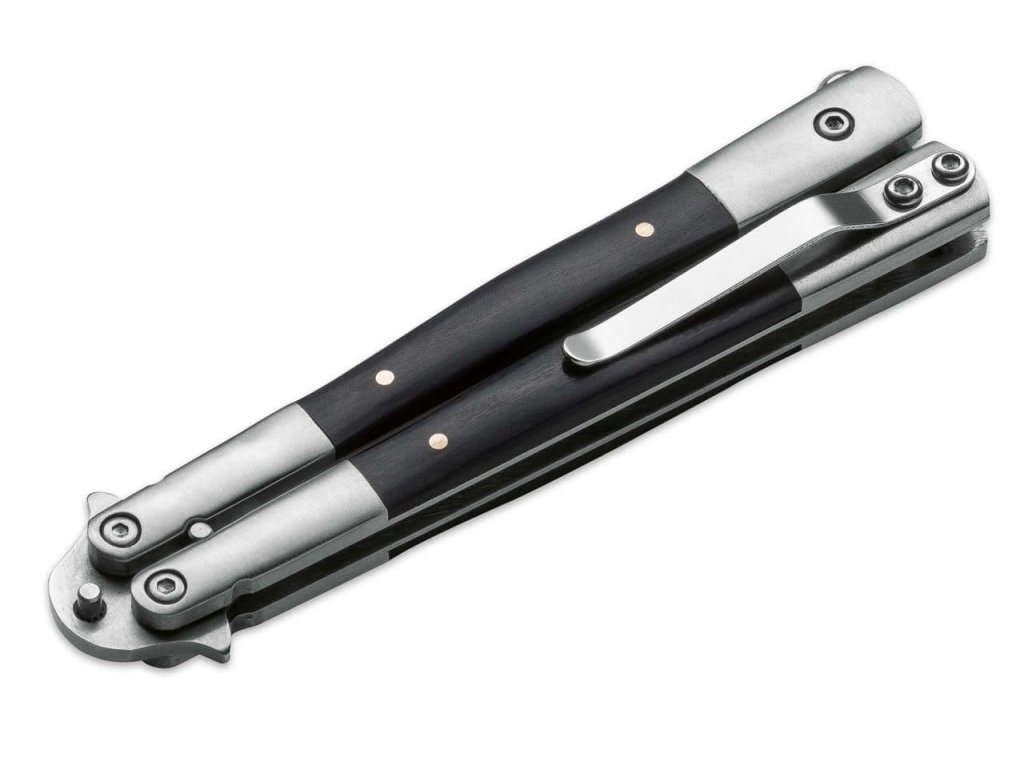 Cuțit Butterfly simplu de la Magnum by Böker. Lamă fabricată din oțel inoxidabil 440 are lungimea de 10,3 cm. Mâner din material compozit durabil pakkawood (combinație de lemn și rășini epoxidice), clemă de agățare din oțel inoxidabil.
