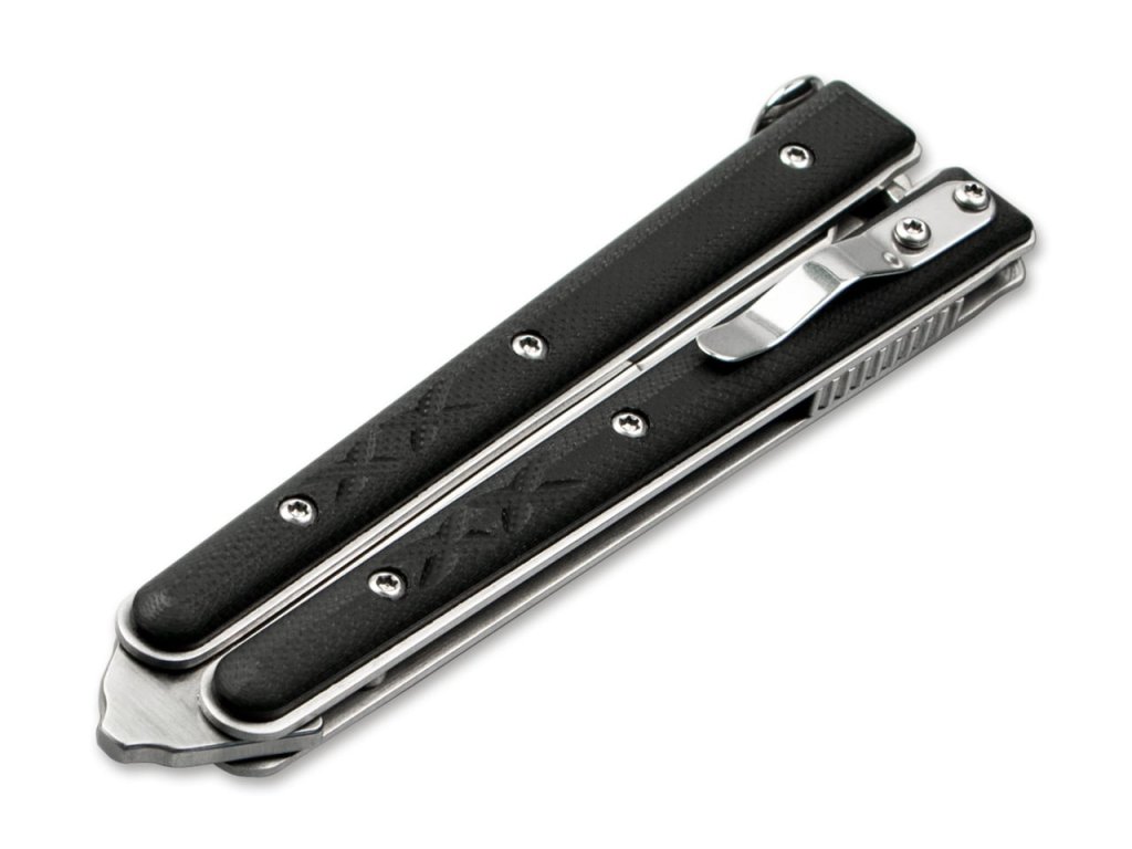 Cuțit Butterfly mai mic de la producătorul german Böker Plus. Lama, din oțel inoxidabil 440C, are lungimea de 8,8 cm. Tăiș combinat. Mâner din G10. Clemă din oțel inoxidabil.