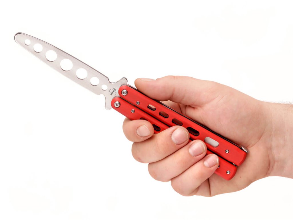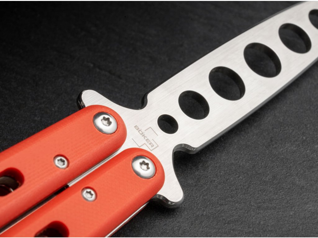 Cuțit Butterfly pentru antrenament de la Böker Plus. Acest cuțit are o lamă neascuțită. Lama este fabricată din oțel inoxidabil, iar mânerul este fabricat din G10 roșu. Lungimea totală a Butterfly-ului este de 23,2 cm, în timp ce lama măsoară 10,3 cm. Greutatea sa este de 154 g, deci imită perfect greutatea unui balisong real, motiv pentru care vă puteți pregăti cu un antrenament adecvat. În multe țări europene este ilegal să deții un Butterfly cu lamă ascuțită, motiv pentru care aceste versiuni de antrenament sunt populare în rândul europenilor pasionați de cuțite care doresc să încerce acest tip de cuțit și cărora legislația nu le permite să facă acest lucru.