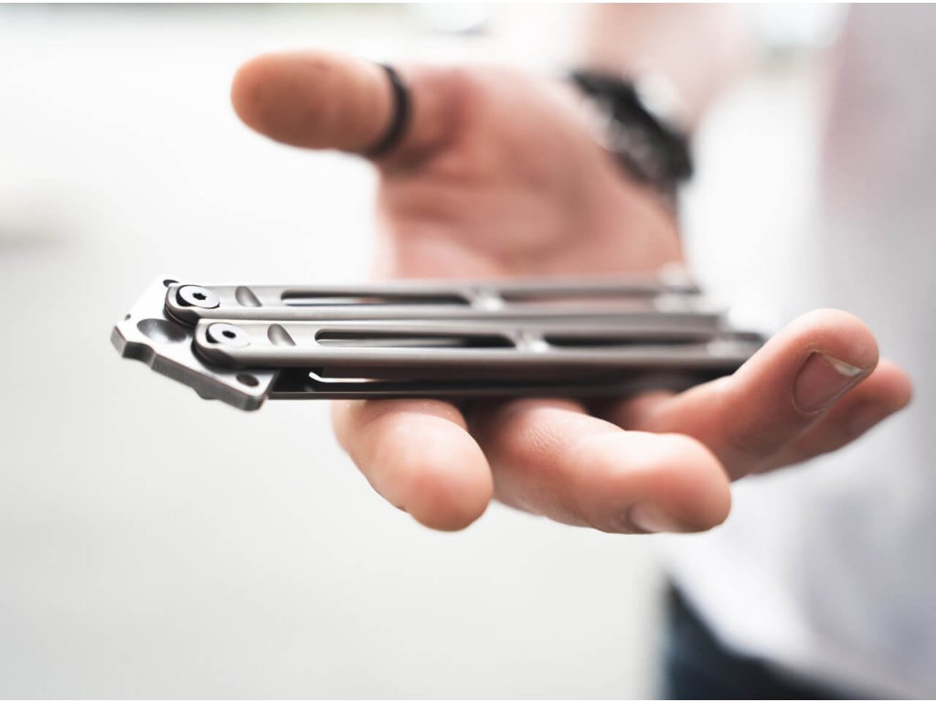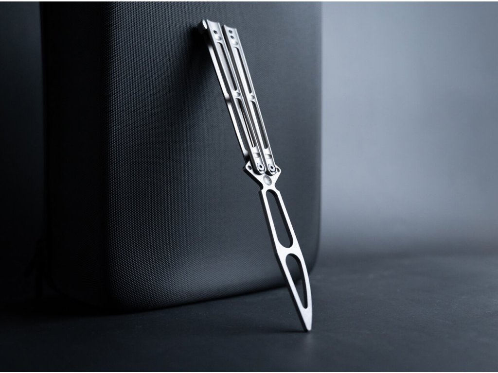 Cuțit Butterfly pentru antrenament de la Böker Plus. Are o lamă neascuțită. Este fabricat în întregime din oțel inoxidabil 420 de culoare gri. Lungimea totală a Butterfly-ului este de 25,2 cm, în timp ce lama măsoară 11,4 cm. Greutatea sa este de 124 g, astfel încât imită perfect greutatea unui balisong real, din acest motiv vă puteți pregăti cu un antrenament adecvat. În multe țări europene este ilegal să deții un Butterfly cu lamă ascuțită, motiv pentru care aceste versiuni de antrenament sunt, populare printre pasionații europeni de cuțite care doresc să încerce acest tip de cuțite și cărora legislația nu le permite să facă acest lucru.