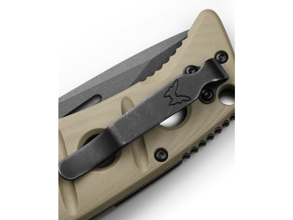 Mânerul G10 de culoare desert tan are găuri distinctive care fac cuțitul mai ușor. Cuțitul are o clemă pentru agățat reversibilă și un orificiu pentru șnur. Este inclusă o teacă nailon. Blocare a lamei tip Axis Lock. Cuțitul este fabricat în SUA.