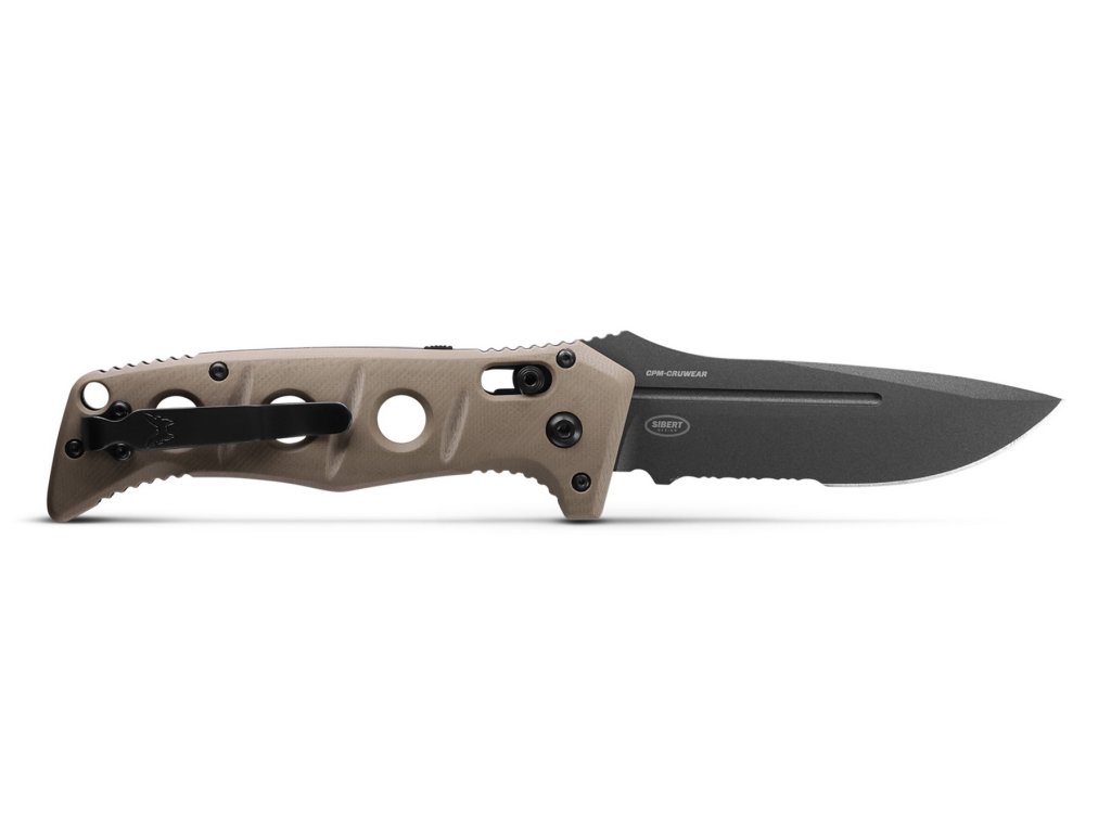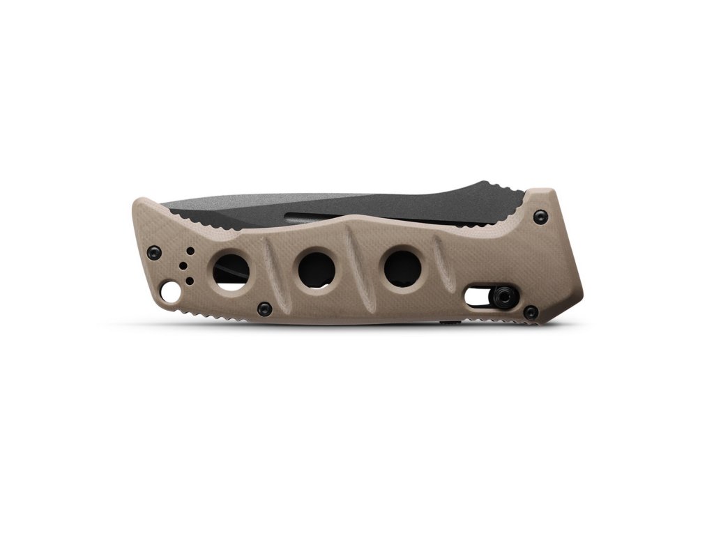 Mânerul G10 de culoare desert tan are găuri distinctive care fac cuțitul mai ușor. Cuțitul are o clemă pentru agățat reversibilă și un orificiu pentru șnur. Este inclusă o teacă nailon. Blocare a lamei tip Axis Lock. Cuțitul este fabricat în SUA.