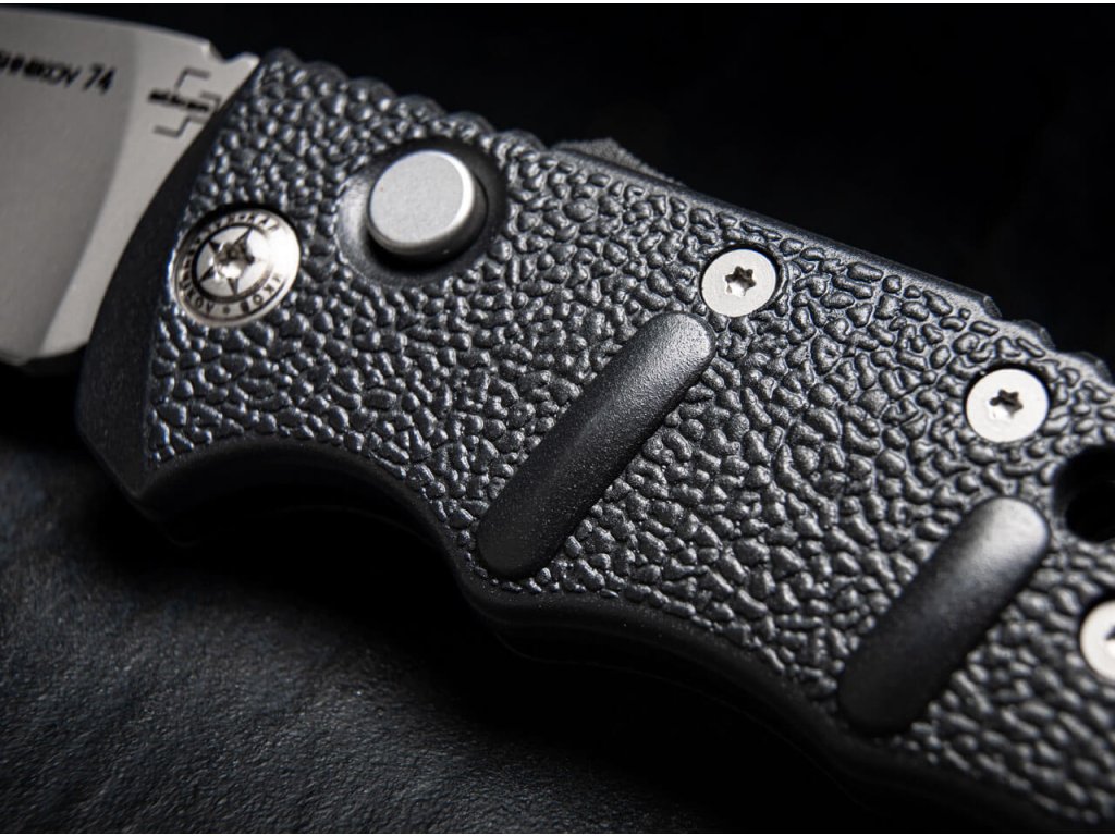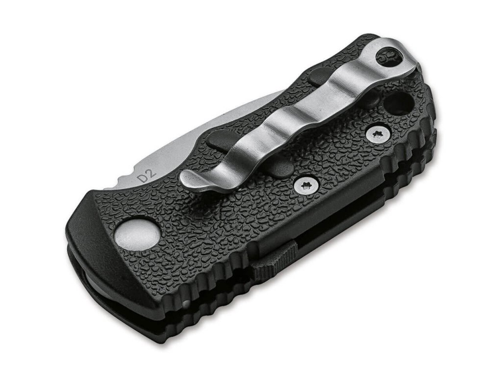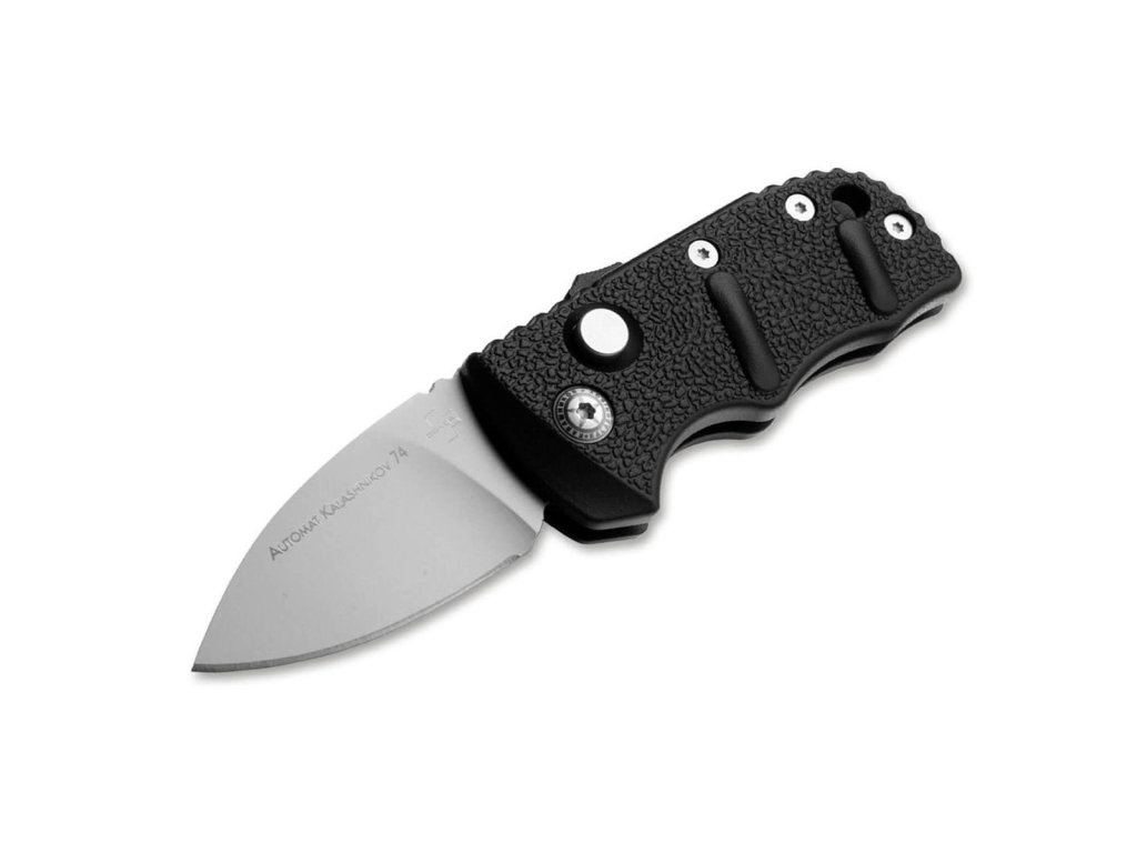 Cuțit mic cu deschidere automată. Lama fabricată din oțel D2 are lungimea de 4,8 cm și un tăiș flat grind. Lungime totală 12 cm. Mâner din aluminiu de culoare neagră ce asigură o prindere sigură în orice situatie. Cuțitul poate fi deschis prin apăsarea unui buton. Clemă pentru agățare. Gaură pentru șnur.