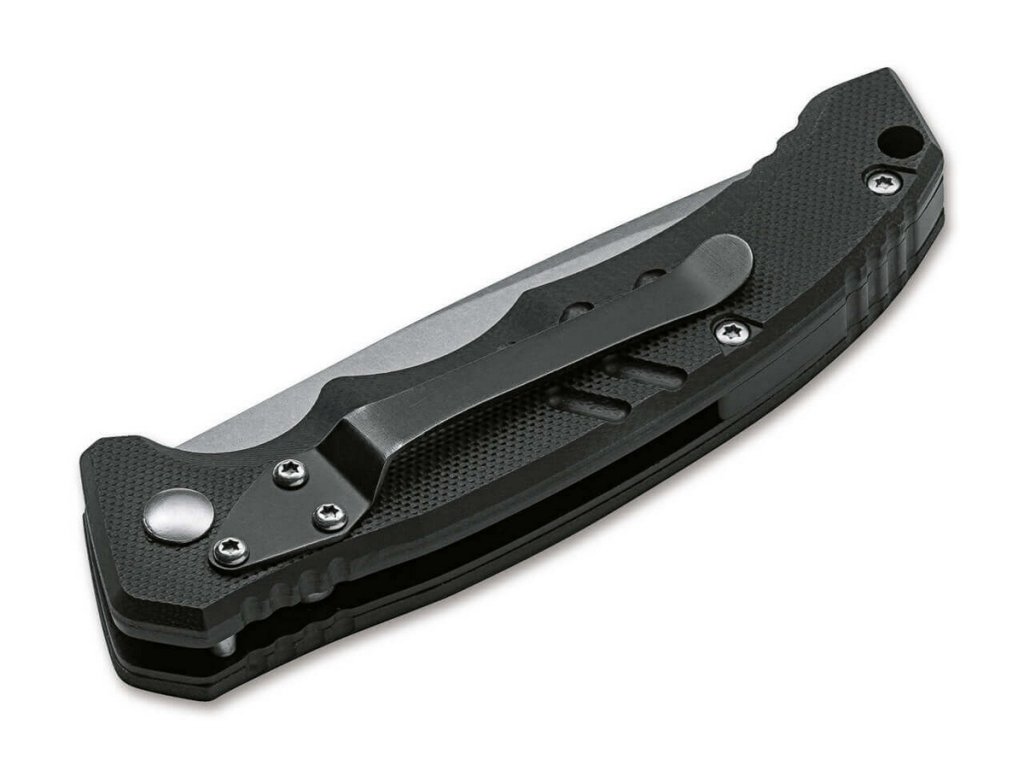 Lama de 8 cm lungime, fabricată din oțel pentru unelte D2 cu finisaj stonewash, are un tăiș flat grind. Mânerul, realizat din G10 negru texturat, are o formă ergonomică. Deschiderea cuțitului se face printr-un buton. Clemă pentru agățarea cuțitului, gaură pentru șnur.