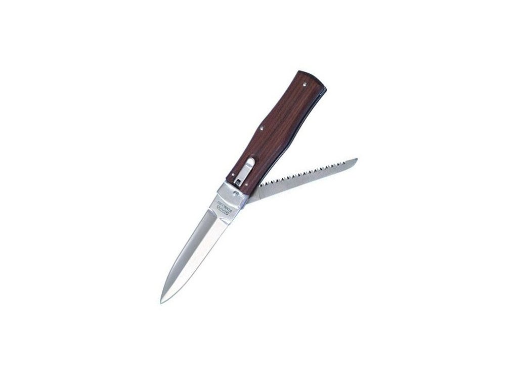 Cuțitul cu deschidere automată PREDATOR are un mâner din lemn, care are o formă ergonomică ce se potrivește perfect în mână. Cuțitul vine într-o teacă luxoasă din piele. Veți găsi și o lamă de fierăstrău. Cuțitul poate fi produs și într-o versiune pentru stângaci, la cerere, (fără costuri suplimentare).