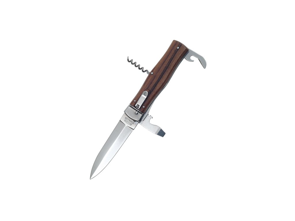 Cuțitul cu deschidere automată PREDATOR are un mâner din lemn, care are o formă ergonomică ce se potrivește perfect în mână. Cuțitul vine într-o teacă luxoasă din piele. Veți găsi și un deschizător de sticle, o șurubelniță, un dezizolator pentru conductori, un deschizător de conserve și un tirbușon. Cuțitul poate fi produs și într-o versiune pentru stângaci, la cerere, (fără costuri suplimentare).