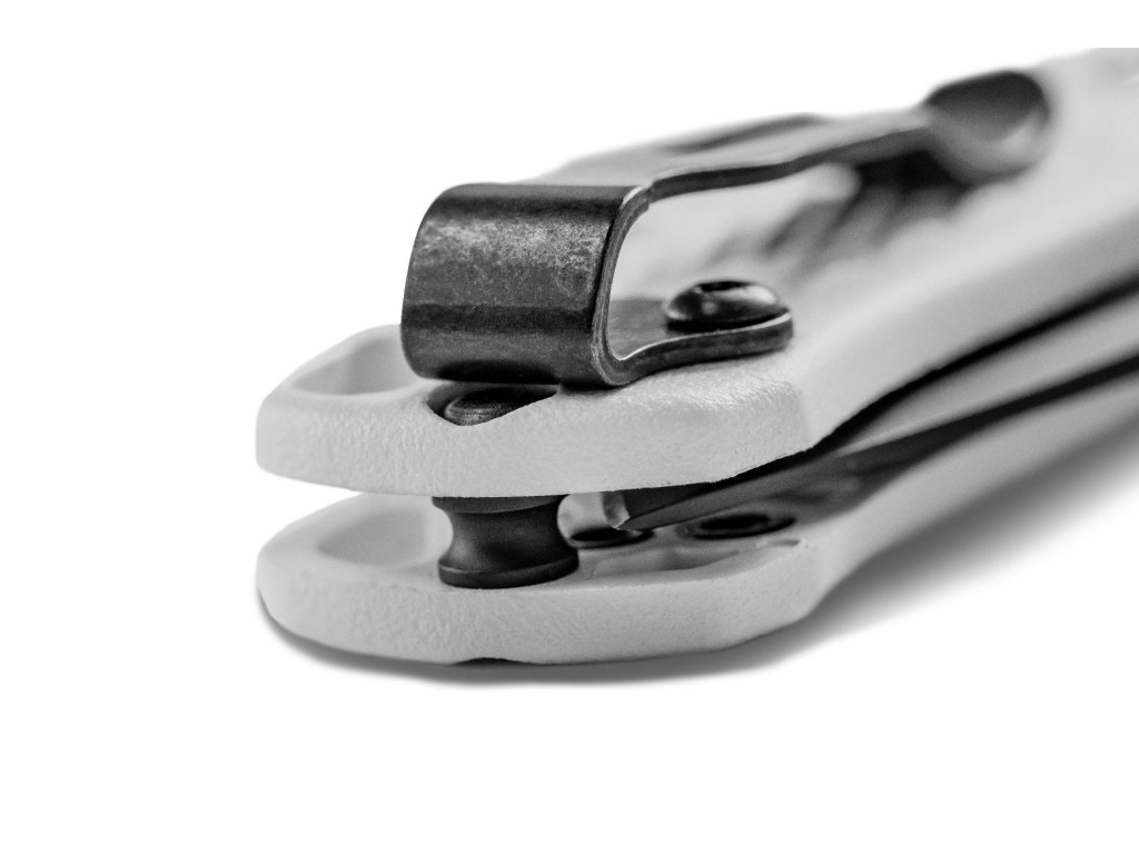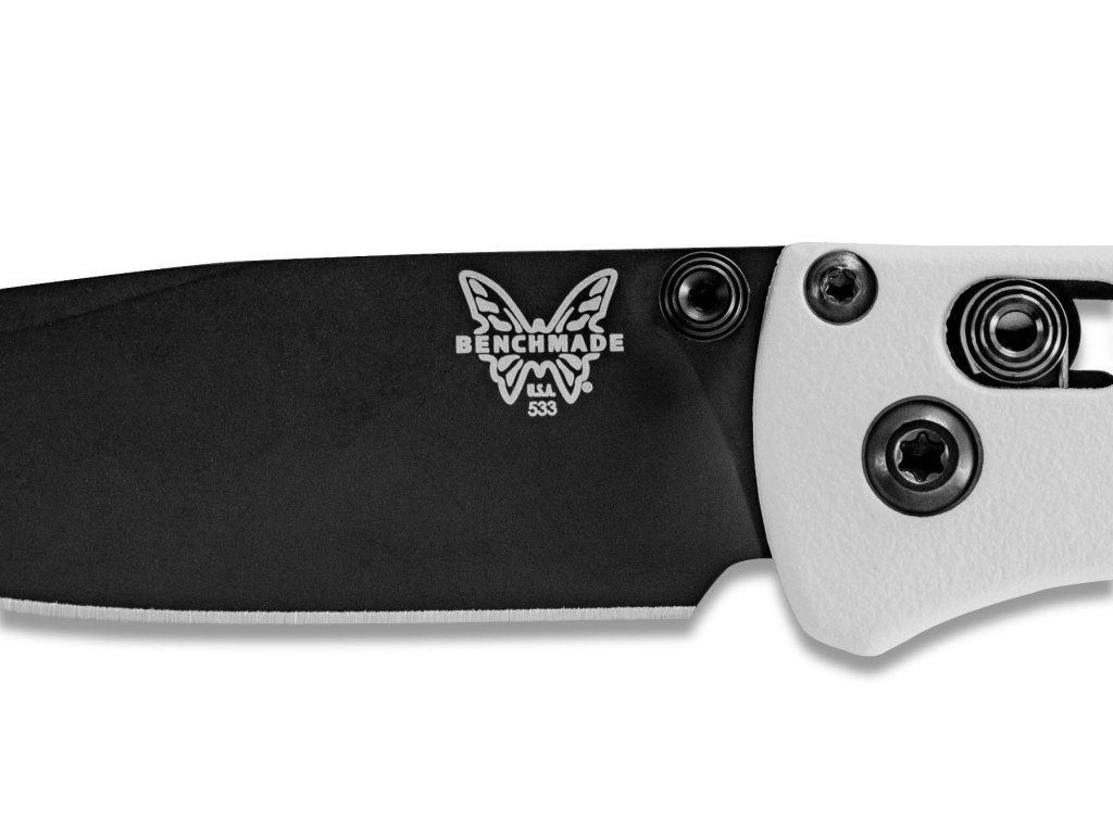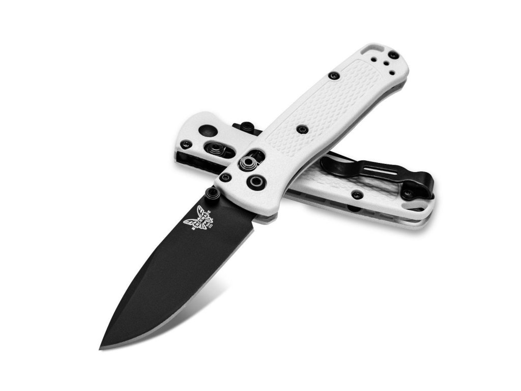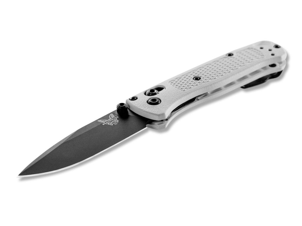 Mini Bugout este o versiune mai mică a popularului model Bugout. Fabricat din aceleași materiale premium ca și fratele său mai mare, este ușor, subțire și ergonomic în același timp. Lama are lungimea de 7,16 cm, este fabricată din oțel inoxidabil premium CPM S30V (duritate 58-60 HRC), are un finisaj DLC negru, tăiș flat grind și formă drop point. Mânerul este fabricat din Grivory (un material plastic extrem de rezistent obținut dintr-o combinație de poliamide termoplastice și rășină) de culoare albă. Cuțitul are un clips pentru agățare care se poate fixa pe ambele părți. Cuțitul este, prin urmare, potrivit atât pentru utilizatorii dreptaci, cât și pentru stângaci. Tip de blocare a lame Axis Lock, are un orificiul pentru șnur - lanyard hole. Deschidere cu o singură mână prin intermediul unui știft pe lamă. Cuțitul este fabricat în SUA.