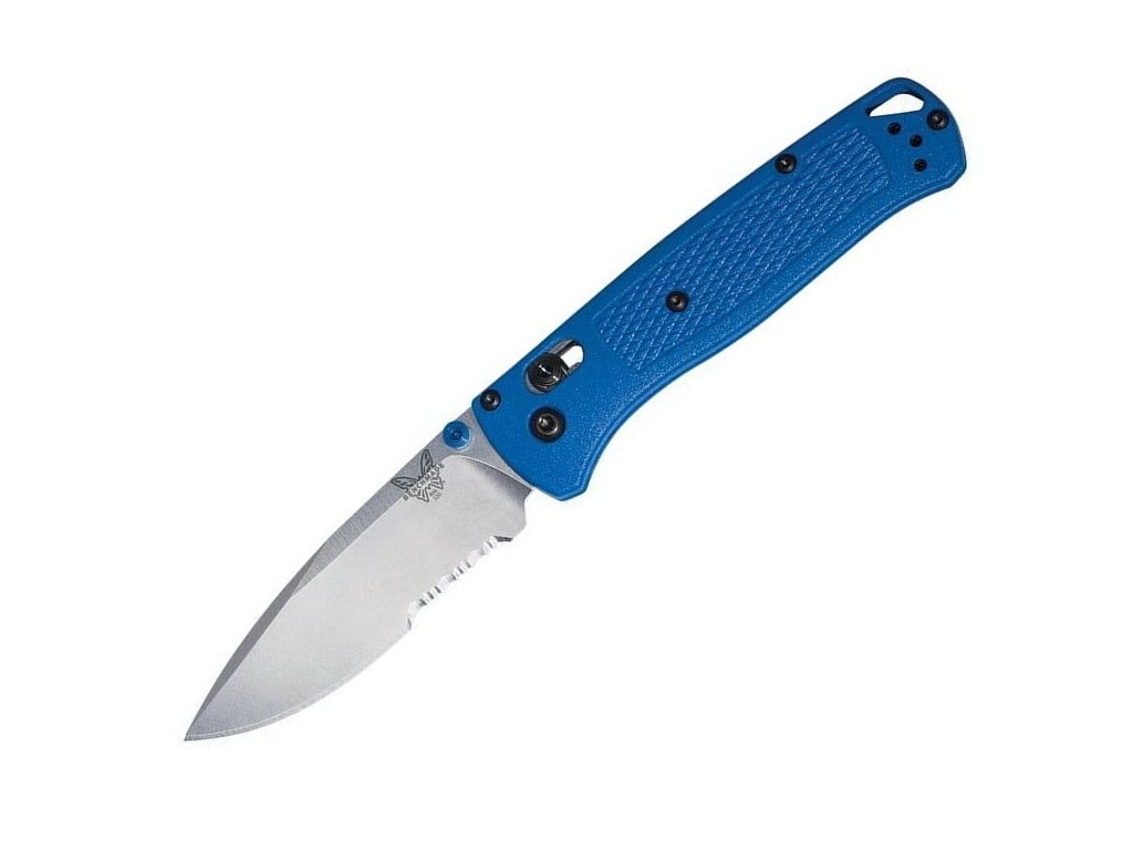 Benchmade Bugout este de mult timp unul dintre cele mai populare cuțite pliabile EDC (pentru uz zilnic). Este fabricat din materiale premium, ușor, subțire și ergonomic în același timp. Are o lamă parțial zimțată de lungime 8,2 cm fabricată din oțel inoxidabil premium CPM S30V (duritate 58-60 HRC), finisaj mat, tăiș flat grind și formă drop point. Mâner din Grivory (un material plastic extrem de rezistent, realizat dintr-o combinație de poliamide termoplastice și rășină) de culoarea albastră. Cuțitul are un clips care se poate fixa pe ambele părți. Cuțitul este, prin urmare, potrivit atât pentru utilizatorii dreptaci, cât și pentru stângaci. Tip de blocare a lamei Axis Lock, are un orificiul pentru șnur. Deschidere cu o singură mână prin intermediul unui știft pe lamă. Cuțitul este fabricat în SUA.