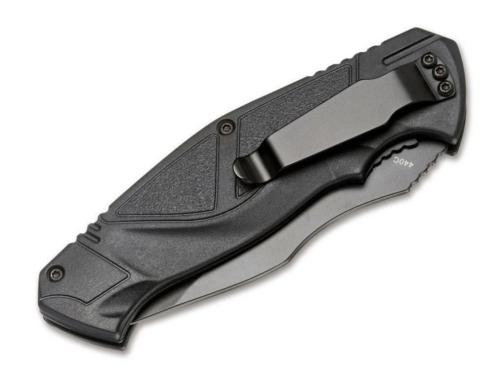 Böker Magnum Advance Pro este un cuțit tactic pliabil cu un raport calitate/preț excelent. Lama fabricată din oțel 440C are o lungime de 8 cm, cu finisaj negru. Mânerul este fabricat din plastic rezistent și durabil. Cuțitul nu poate fi deschis cu o singură mână. Blocare tip liner lock, clemă pentru agățare. Cuțitul este livrat cu o teacă din nailon rezistent.