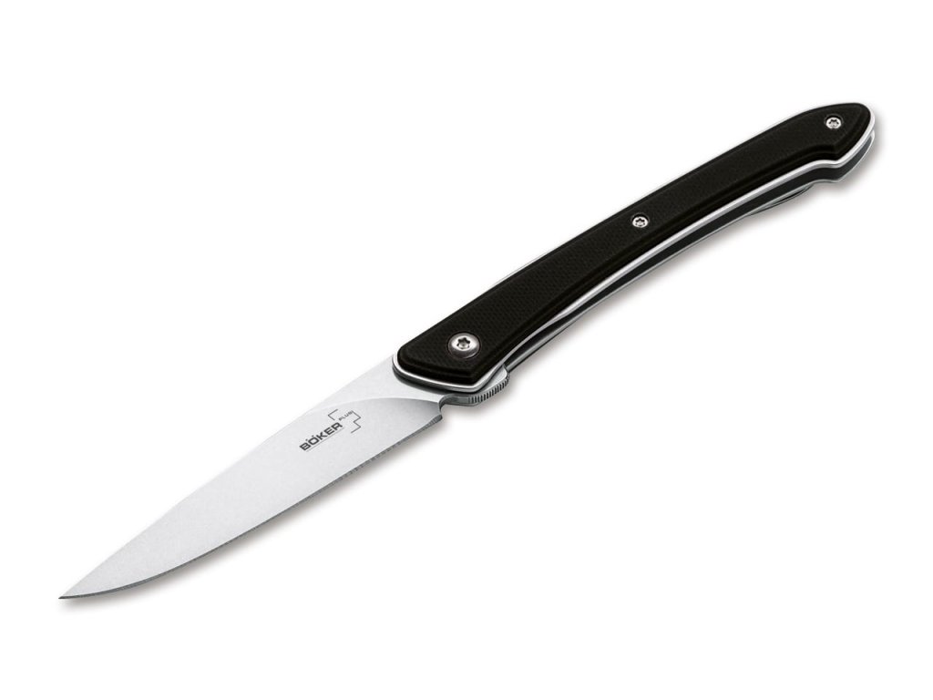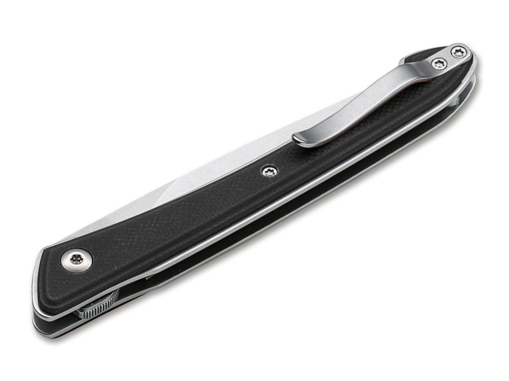 Böker Plus Spillo este un cuțit elegant de gentleman. Greutate doar 46 de grame, ceea ce îl face aproape de neobservat atunci când îl purtați. Lama, subțire fabricată din oțel inoxidabil VG-10, are un tăiș tip flat grind, o lungime de 8 cm și este montată pe rulmenți. Blocare tip Liner Lock. Mâner realizat din G10 de culoare neagră. Cuțitul poate fi deschis cu o singură mână, folosind flipperul. Clemă pentru agățare.