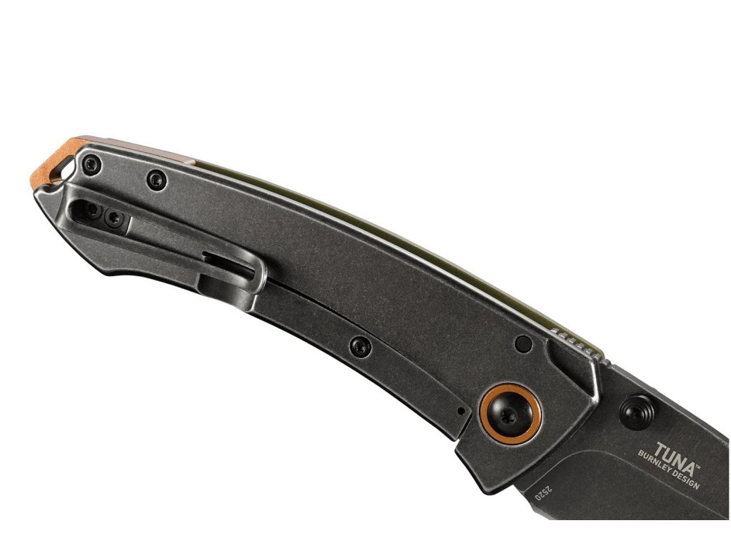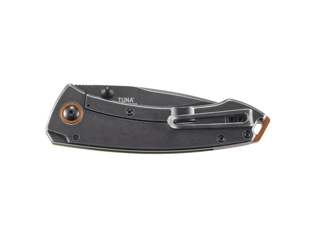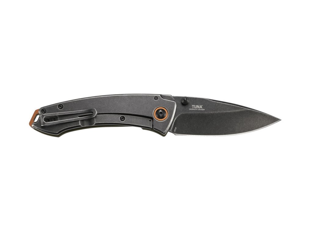 CRKT Tuna este un cuțit pliabil universal excelent pentru utilizare zilnică. Și-a primit numele de la forma lamei, care seamănă cu un ton. Mânerul este fabricat din G10 pe o parte și din oțel inoxidabil pe cealaltă parte. Blocare a lamei tip Frame Lock. Lama, de lungime 8,18 cm, din oțel 8Cr14MoV, are un finisaj mat, o formă spear point și un tăiș tip flat grind. Deschidere cu o singură mână prin intermediul unui știft pe lamă. Clemă pentru agățare. Cuțitul a fost proiectat de cunoscutul designer de cuțite Lucas Burnley.