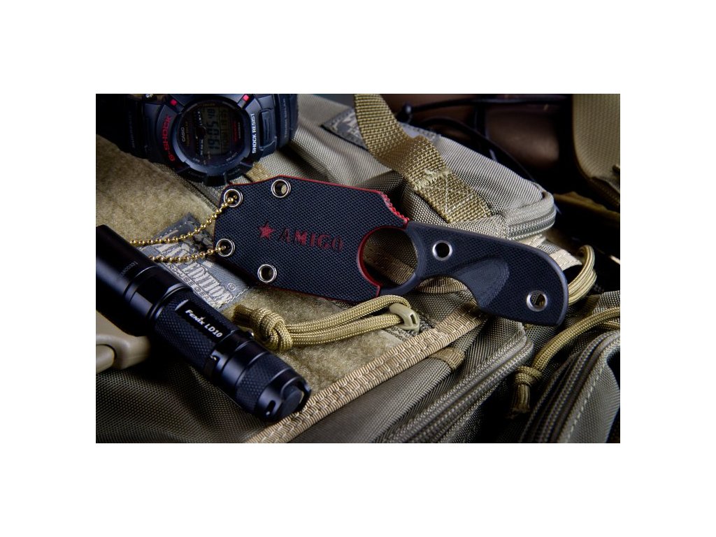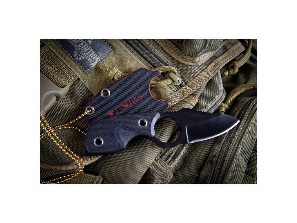 Amigo este un cuțit cu lamă fixă conceput în principal pentru a fi purtat în jurul gâtului. Lama are o lungime de 6,9 cm, este fabricată din oțel inoxidabil japonez AUS-8, cu tăiș tip hollow grind și finisaj black titanium. Mâner din G10, negru, teacă din kydex.