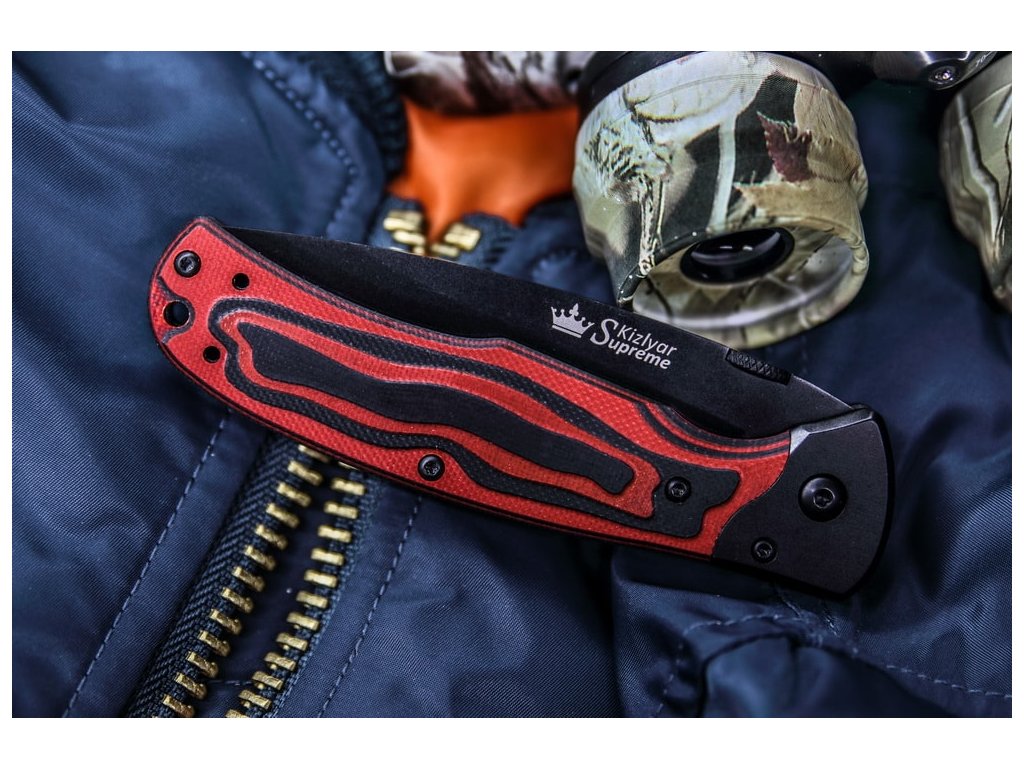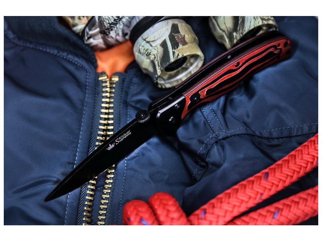 Cuțit pliabil, elegant, Kizlyar Supreme, potrivit pentru utilizarea zilnică. Lamă din oțel D2, duritate 60-62 HRC. Mâner din G10. Clemă pentru agățare la curea. Cuțit proiectat de designerul australian Julius Conrad.