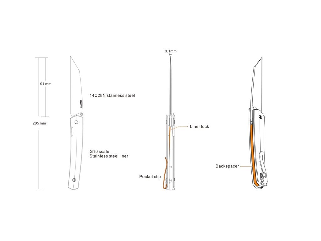 Cuțit pliabil, cu un design foarte elegant și o greutate de numai 70 g. Lama, de 3 mm grosime, din oțel inoxidabil Sandvik 14C28N, cu tratament criogenic are o lungime de 9,1 cm și tăiș flat grind. Lama cu finisaj mat poate fi deschisă cu o singură mână, cu ajutorul unui știft de pe lamă. Mâner din G10. Are o clemă de prindere din oțel inoxidabil. Cuțitul este prevăzut cu un sistem de blocare a lamei tip liner lock.