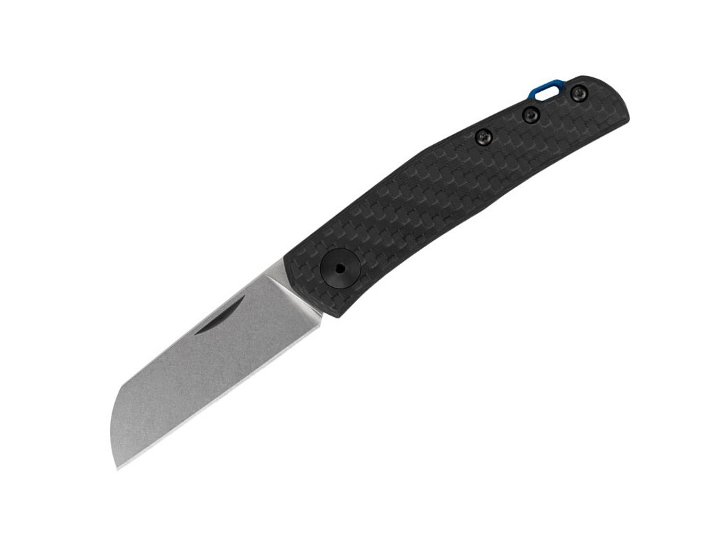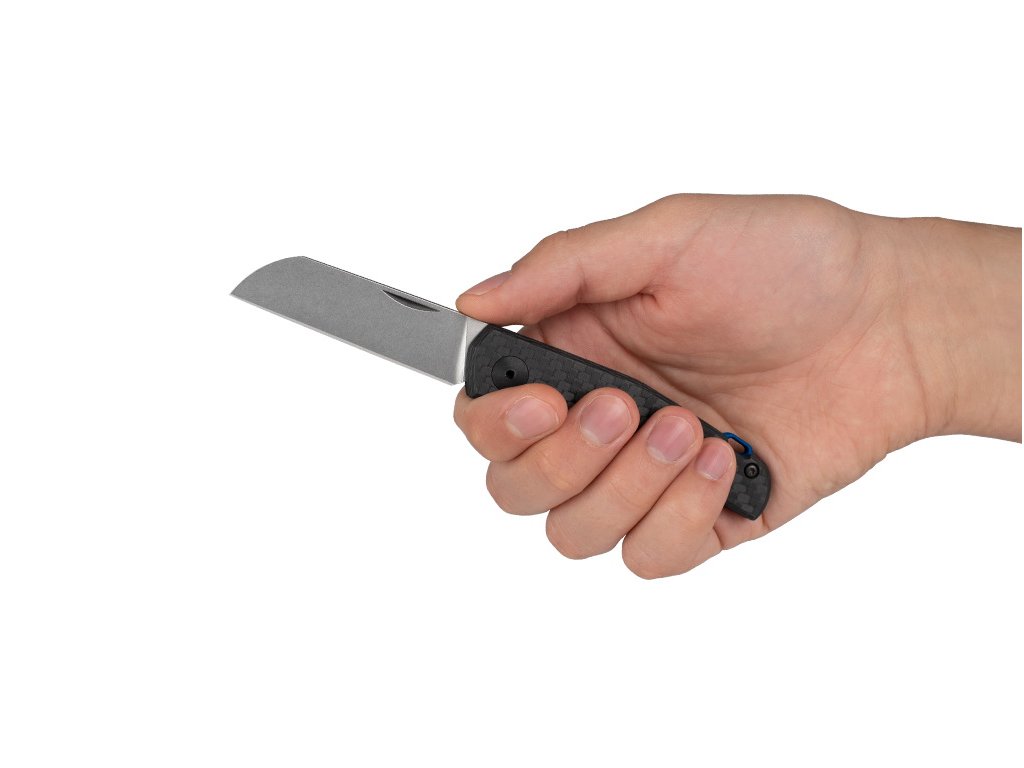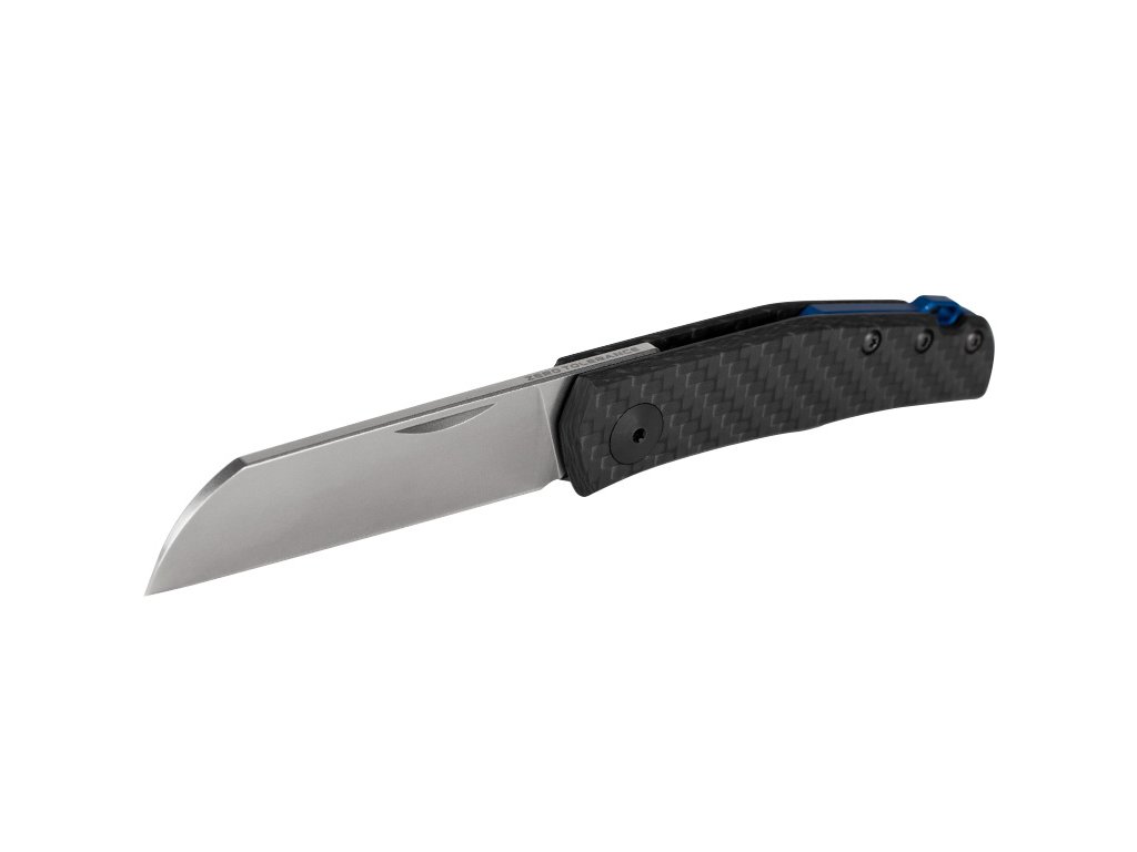 Lama de lungime 6,6 cm, fabricată din oțel inoxidabil CPM 20CV exclusiv, atinge o duritate ridicată și are o bunp rezistență la coroziune și la uzură. Lama are o formă sheepsfoot, tăiș tip flat grind și finisaj stonewash. Mânerul este realizat din fibră de carbon, ceea ce face cuțitul extrem de ușor (51 g).