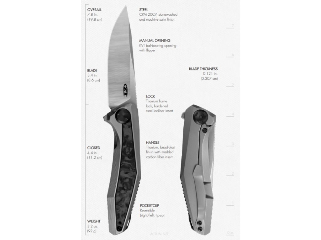 ZT0470 este un produs nou al anului 2019, creat de la Dmitry Sinkevich. Este un EDC practic care, cu o lungime totală de 19,8 cm, face fașă tuturor sarcinilor uzuale. Lama de 8,6 cm lungime este realizată din oțel inoxidabil CPM 20CV exclusiv, care atinge o duritate ridicată și are o bună rezistență la coroziune și la uzură. Lama are un finisaj mat combinat cu stonewash, o formă drop point și un tăiș tip flat grind. Mâner din titan cu inserți din fibră de carbon. Blocare a lamei tip frame lock. Deschiderea ușoară cu un flipper a cuțitului este asigurată de sistemul KVT cu rulmenți cu bile. Are o clemă pentru agățarea cuțitului.