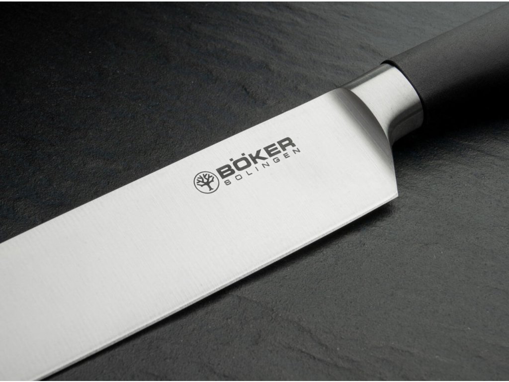 Cuțitul de bucătărie pentru feliat Böker Core Professional cu lungimea lamei de 21 cm este rezultatul combinării a aproape 150 de ani de experiență a producătorului de cuțite Solingen cu experiența principalilor comercianți cu amănuntul germani. Seria se bazează pe expertiza comercianților cu amănuntul, pe interesul lor pentru cuțite și pe tradițiile de lungă durată. Rezultatul este o serie de cuțite dinamice cu proprietăți de tăiere excepționale și o manevrabilitate excelentă.