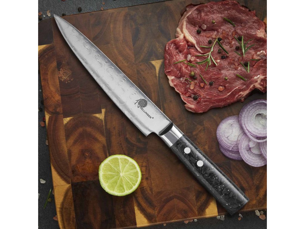 Cuțitul extrem de ascuțit Dellinger Carbon Fragment Slice din oțel de Damasc de calitate, cu lungimea lamei de 17 cm, este ideal pentru a obține felii subțiri pe farfurie. Cuțitul pentru feliat vă va asigura că puteți tăia într-un mod exemplar fiecare salam, cârnat sau rață prăjită. Mâncărurile tăiate își păstrează suculența și gustul excelent. Lucrul cu cuțitele pentru feliat este extrem de precis, rapid și simplu. Dacă doriți felii perfecte în fiecare zi, cuțitele pentru bucătărie marca Dellinger sunt alegerea evidentă.
