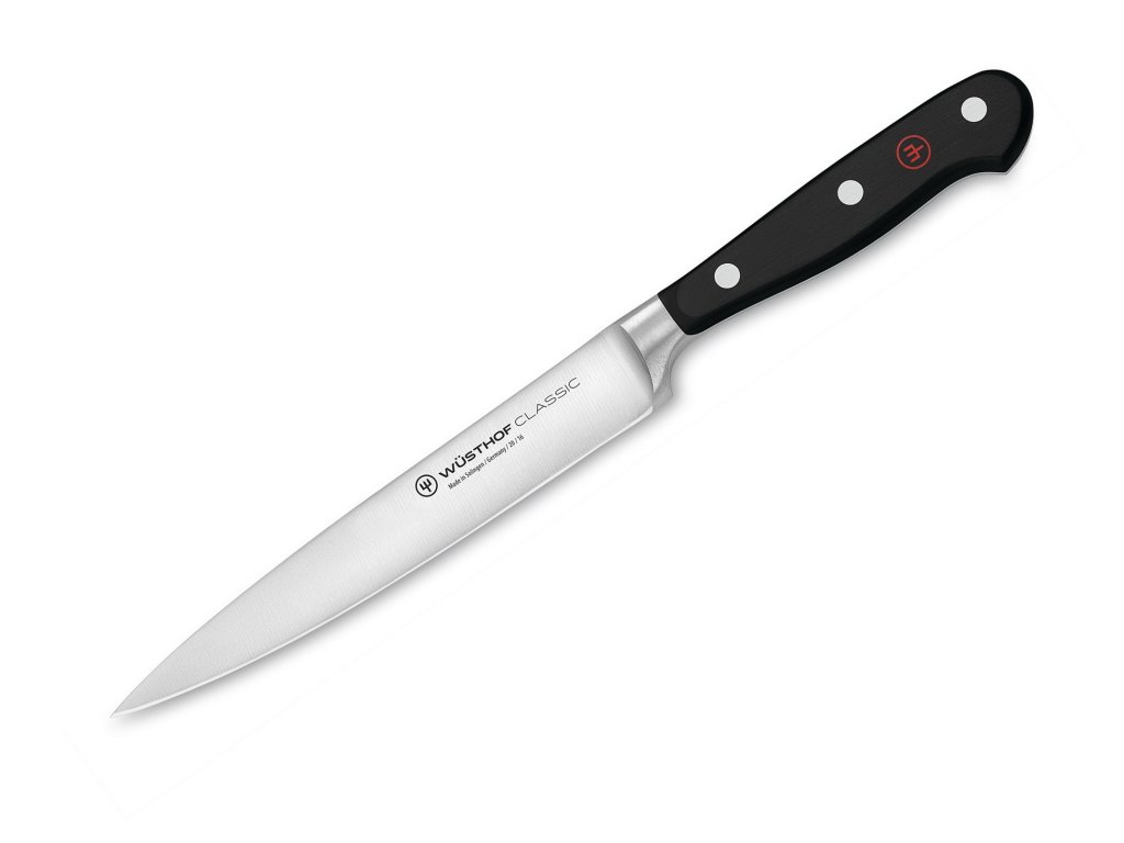 Cuțitul pentru feliat Wüsthof Classic cu lungimea lamei de 16 cm este un cuțit pentru bucătărie forjat manual, cu design tradițional și nituire triplă. Seria Classic este alegerea ideală pentru bucătarii amatori care își amenajează o bucătărie nouă și caută echipamente accesibile din gama premium Wüsthof sau doresc să își înlocuiască vechile ustensile de bucătărie cu unele noi. Toate cuțitele din seria Wüsthof Classic combină eleganța, eficiența și rezistența ridicată, datorită cărora se potrivesc perfect în orice mediu.