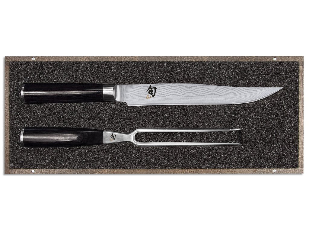 Setul de cuțite pentru bucătărie damasc include un cuțit pentru feliat și o furculiță pentru carne din ediția KAI Shun Classic.