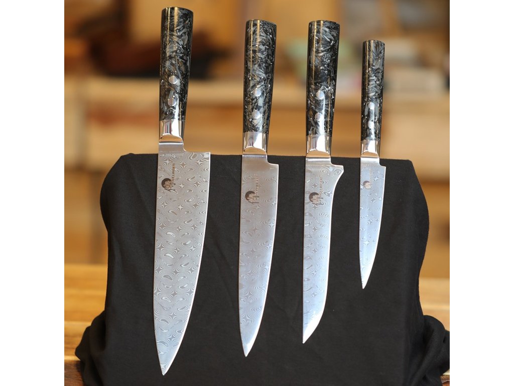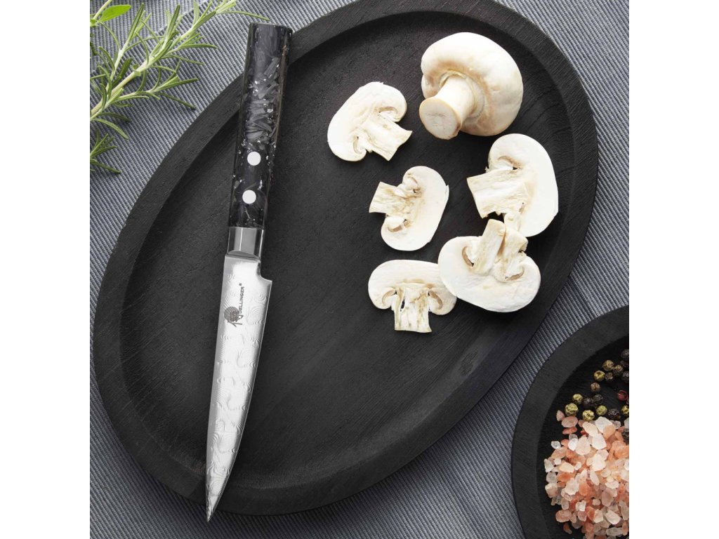 Cuțitele din seria „Dellinger Carbon Fragment” reprezintă simbolul cuțitelor moderne. Lama acestui cuțit este fabricată printr-o metodă de călire de foarte bună calitate, în cuptoare cu vid, speciale, care sunt apoi răcite cu azot. Cuțitul este ascuțit la un unghi de 12-15 grade pentru a obține o duritate de aproximativ 60 HRC și o ascuțime excepțională. Cuțitele sunt ideale și pentru grătar sau gătit în aer liber. Oțelul de Damasc utilizat nu conține niciun miez (Full Damascus) și îndeplinește toate cerințele dvs. pentru un cuțit modern.