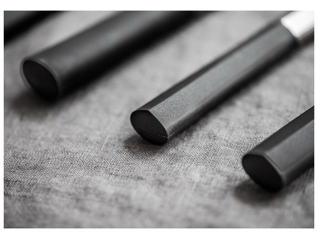 Estetica minimalistă japoneză este accentuată de mânerul negru elegant, fabricat din plastic rezistent la apă. Materialul este foarte plăcut la atingere, datorită adaosului de pudră de bambus.