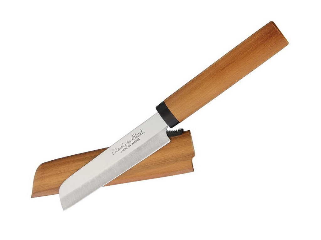 Cuțitul Kanetsune Seki Fruit Knife KC076 Kama-gata este un cuțit pentru bucătărie japonez mai mic, potrivit pentru lucrul cu fructe și legume, cu lama lungă de 8,8 cm din oțel inoxidabil 420J2. Mânerul și protecția lamei sunt fabricate din lemn de cireș sălbatic.