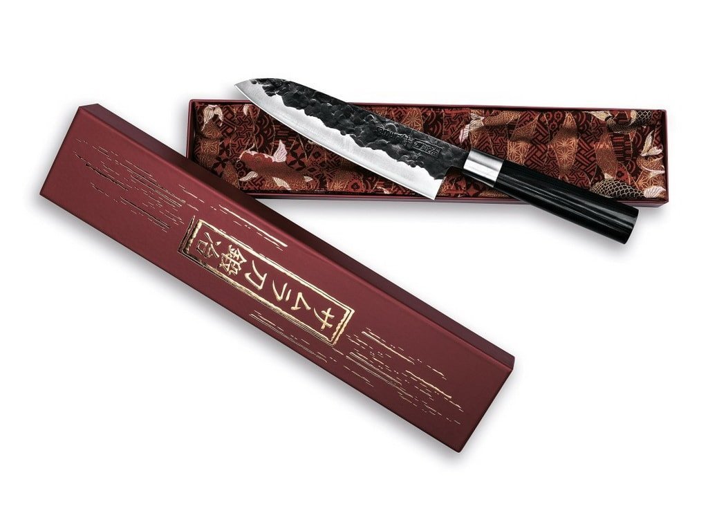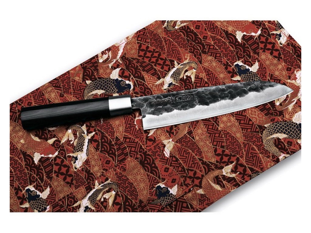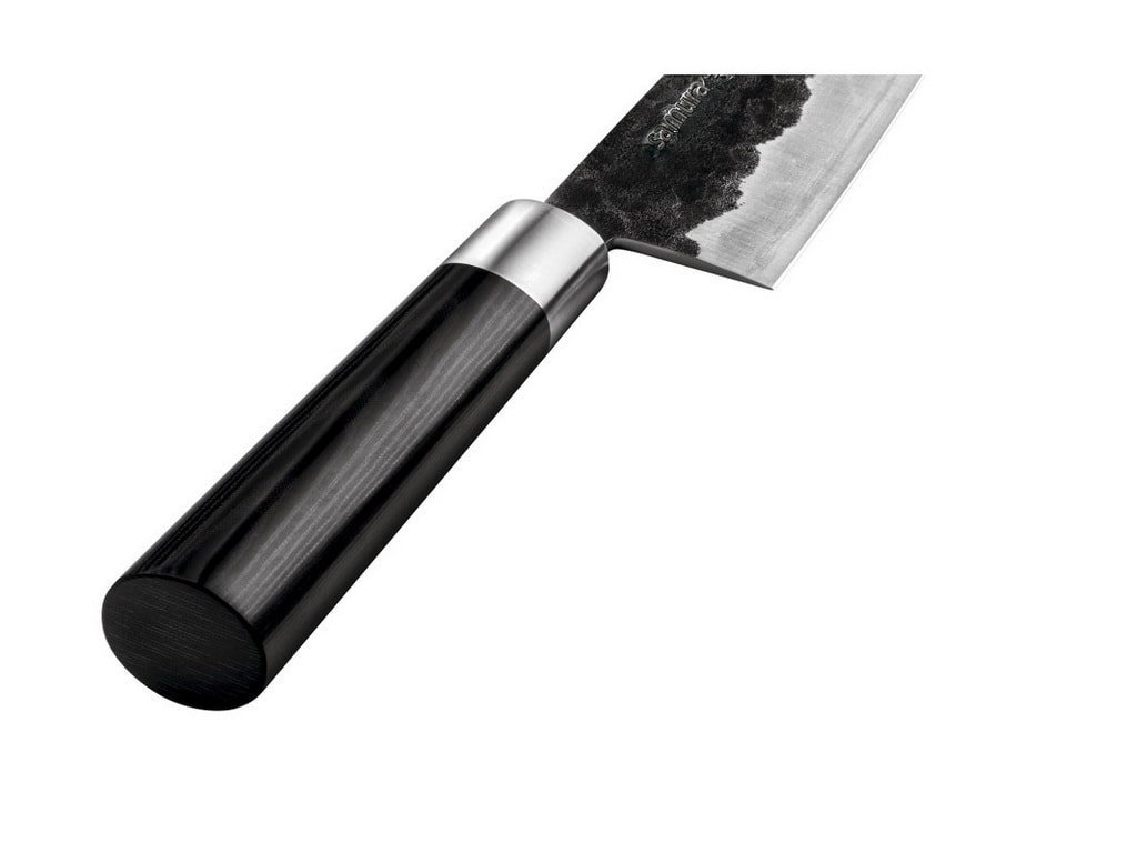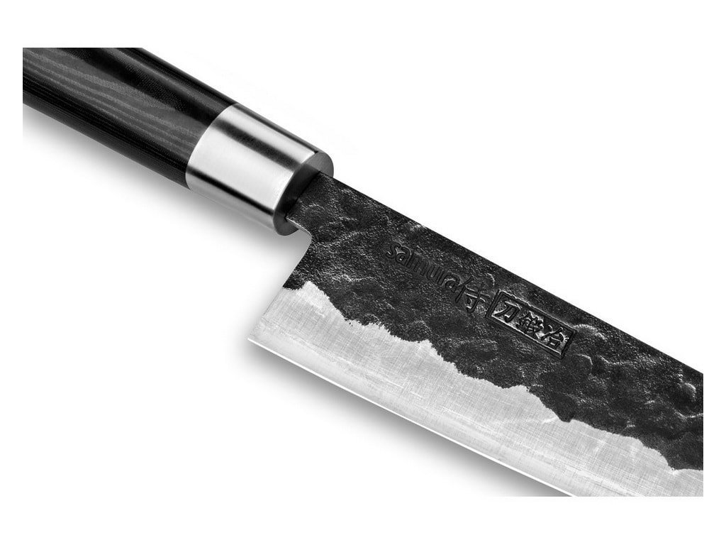 Cuțitele Samura Blacksmith sunt cuțite pentru bucătărie exclusive, care oferă forme tradiționale japoneze, mâner din material compozit rezistent micarta și lame din oțel inoxidabil japonez AUS-8 forjat manual. Avantajul oțelului forjat manual este rezistența și fiabilitatea ridicată, precum și aspectul neobișnuit, deoarece fiecare piesă este originală. Finisajul suprafeței lamei hammered steel este foarte atractiv și asigură o tăiere lină, fără ca alimentele tăiate să se lipească de cuțit. Cuțitul este ambalat într-o husă din pânză foarte frumoasă, în stil japonez, și depozitat într-o cutie cadou.